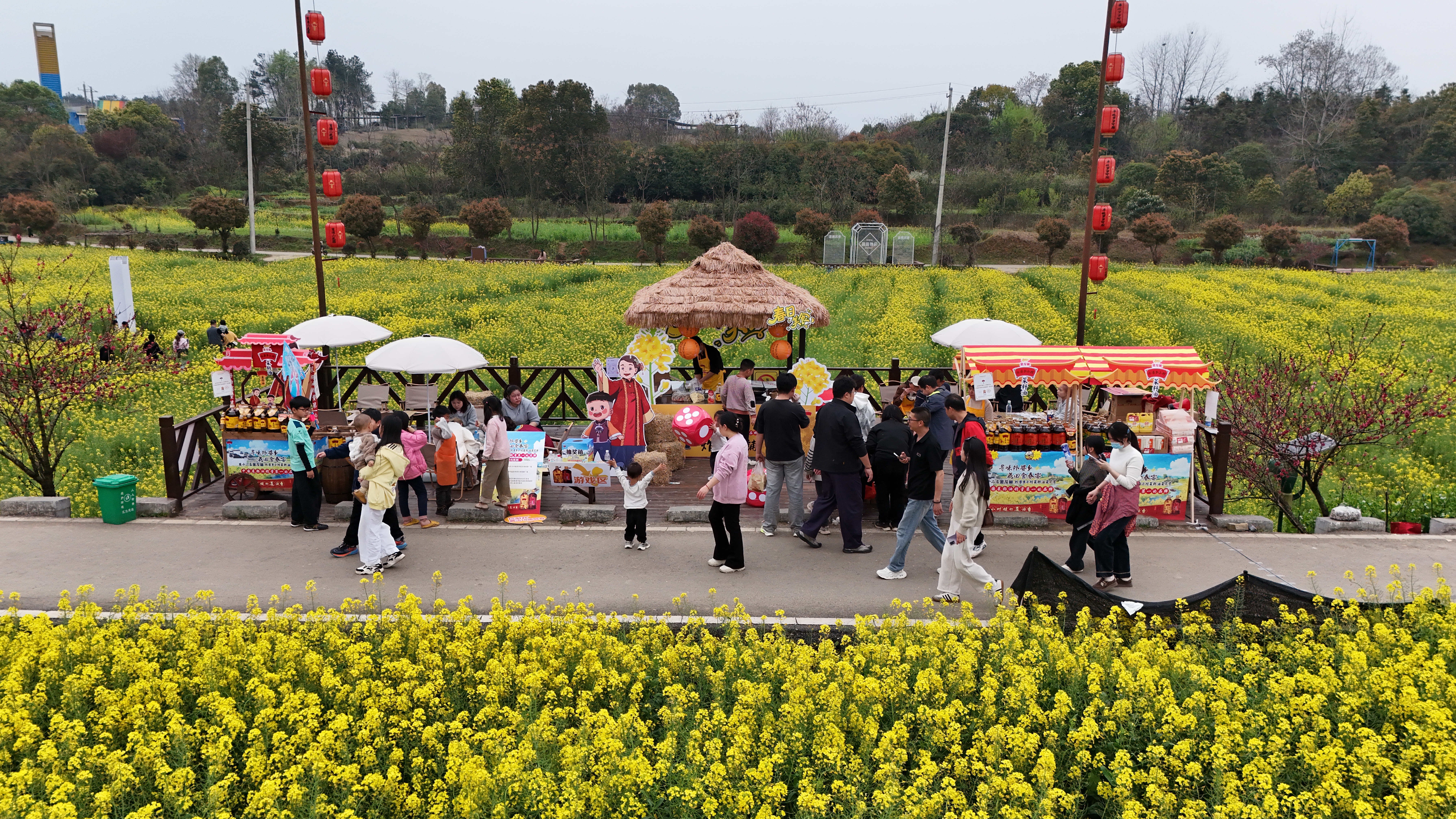 花海各处的打卡点同样人气高涨,游客们或依托花海中的指示牌、景观造型拍照留念,或与非遗表演道具、市集摊位合影打卡,将春日花海的浪漫与活动的乐趣完美融合。“早就听说这里的油菜花海特别美,特意带着家人过来,能穿着汉服在花海中拍照,既能定格美景,又能留下专属纪念,太贴心了。”来自武汉的游客李丽芳笑着说道。