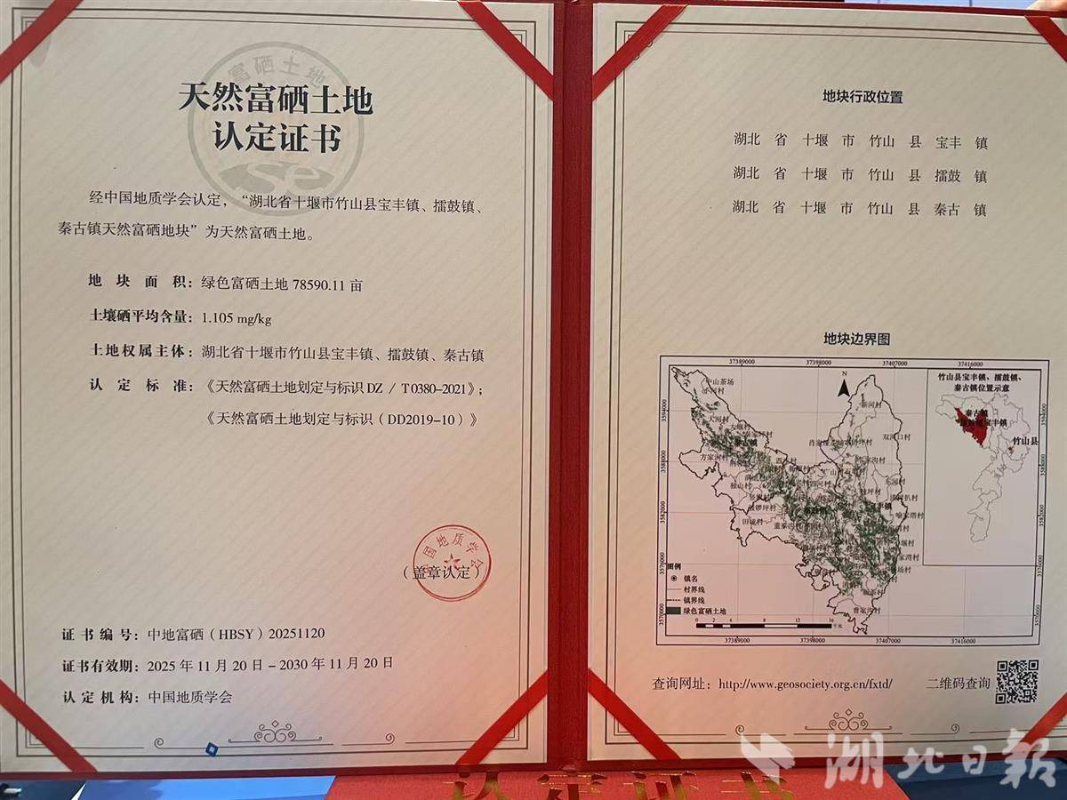 证书显示,在竹山县宝丰镇、擂鼓镇、秦古镇境内,总面积达78590.11亩的跨乡镇连片地块,全部为天然富硒土地,平均每公斤土壤硒含量达1.105毫克,比国家认定标准(每公斤土壤含0.39毫克硒)高出近3倍。