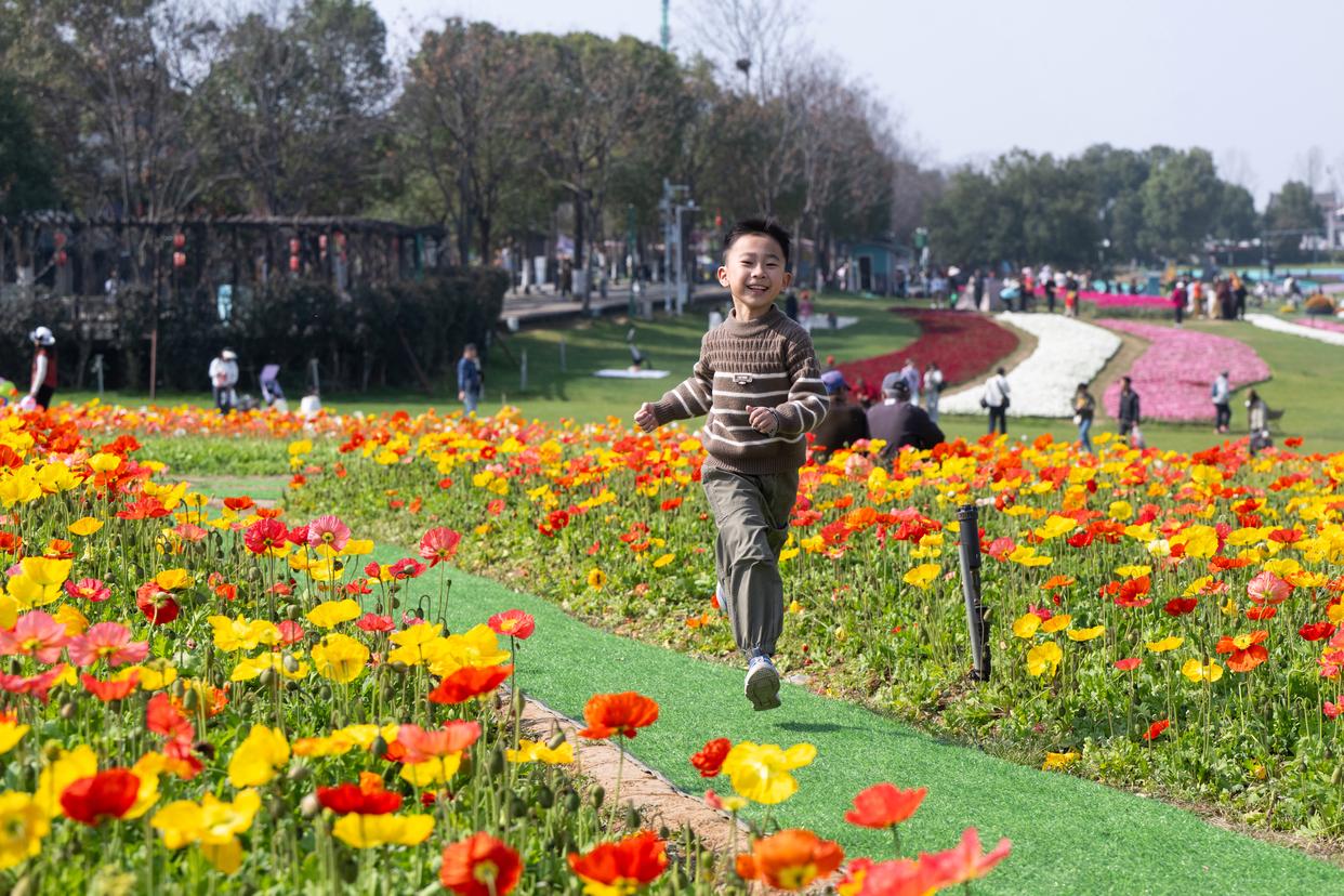 小朋友在武汉花博汇赏花玩耍。新华社记者 肖艺九 摄