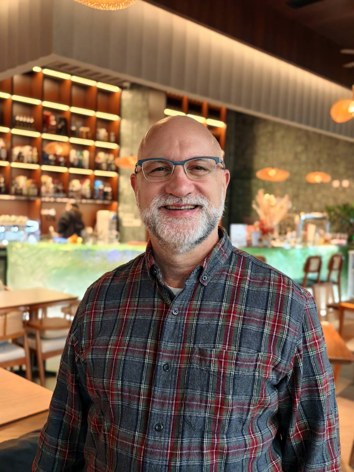 3月17日下午,武汉爱乐花美式西餐酒吧,蓄着一脸花白胡子的卡腾龙正和同事交流工作,这是他去年新开的餐厅,中外好友时常相聚于此。