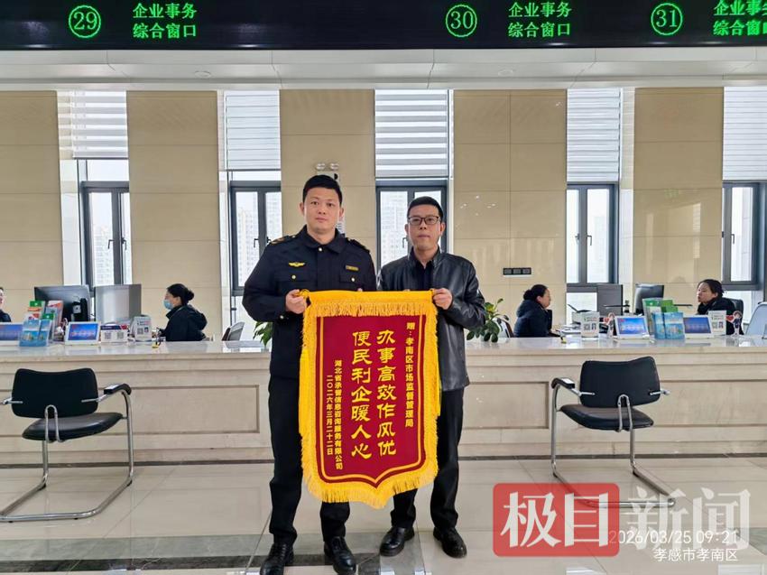 3月25日上午,一面印着“便民利企暖人心 办事高效作风优”的锦旗,被专程送到孝感市孝南区市场监督管理局注册登记窗口,辖区一家企业的负责人将这份荣誉交到工作人员手中,为窗口高效暖心的服务点赞。