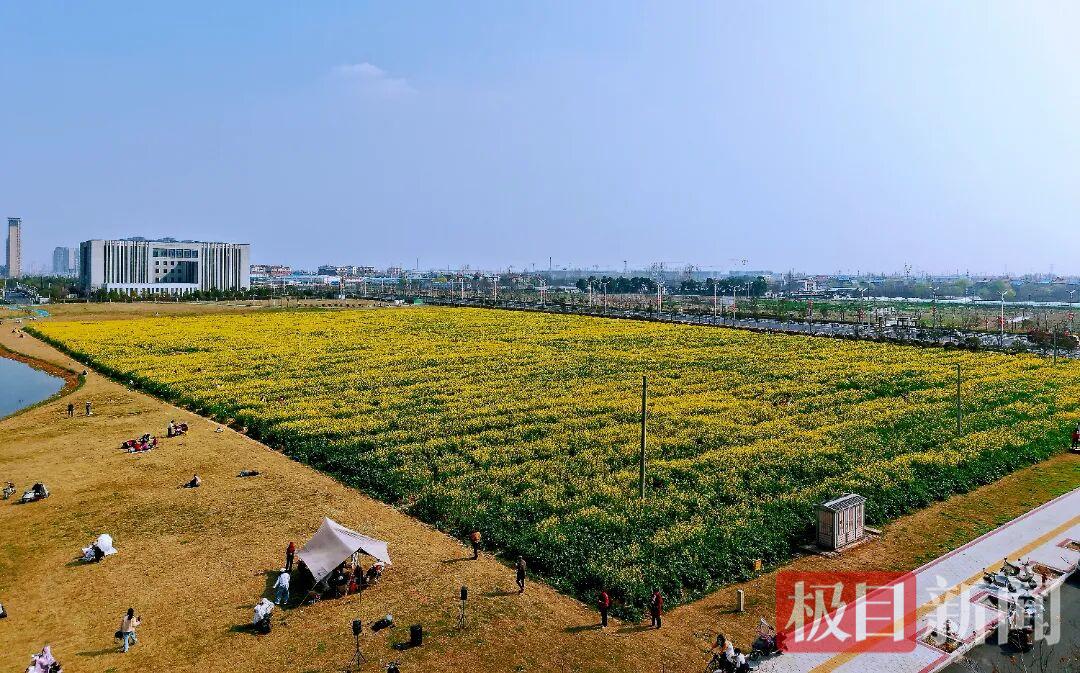 春光和煦,暖意融融。孝感市孝南区政务服务中心西侧的口袋公园里,油菜花开得正盛。旁边的草地上,一顶顶帐篷错落撑开,孩子们追逐着风筝奔跑,大人们悠闲地躺在野餐垫上晒太阳,惬意十足。