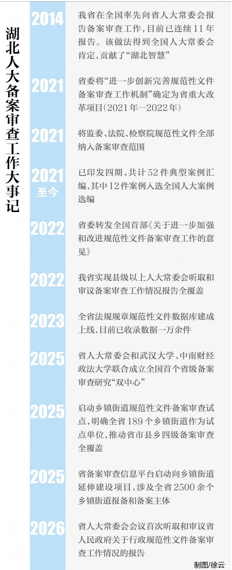 我省于2014年在全国率先向省人大常委会报告备案审查工作,该做法得到全国人大常委会肯定,贡献了“湖北智慧”。2022年,省人大常委会进一步拓展报告主体,推动实现全省县级以上人大常委会听取和审议备案审查工作情况报告全覆盖。今年,省人大常委会首次听取和审议省人民政府关于行政规范性文件备案审查工作情况的报告。