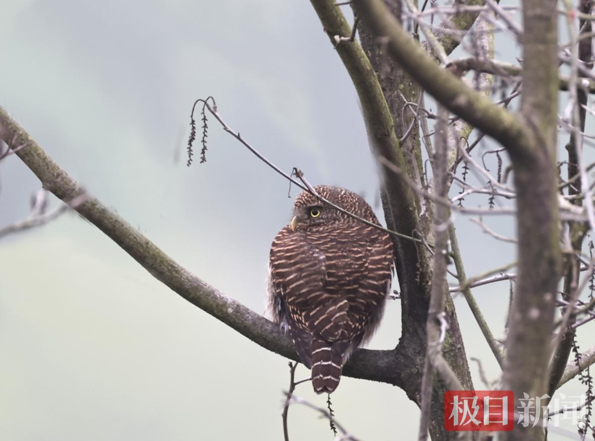 现场观察到,这只斑头鸺鹠体型小巧,通体覆盖着棕褐色横斑羽毛,与枫杨树皮纹理巧妙融合,起到了很好的伪装作用,黄色的眼瞳明亮有神,目光锐利,尽显小型猛禽的灵动与机警。据了解,斑头鸺鹠俗名猫头鹰、鬼东哥,隶属于鸱鸮科鸺鹠属,是鸺鹠中个体较大的种类,2021年被列入中国《国家重点保护野生动物名录》二级保护范畴。