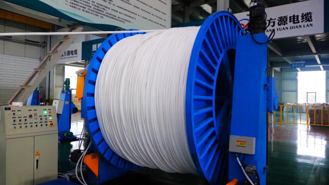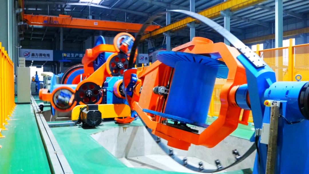 在湖北鑫方源电气线缆有限公司的生产车间,成揽机正高速运转,原材料经过前期的拉丝、绞线、绝缘之后,通过这台成揽机加工形成电缆半成品,后期再进行外部绝缘以及检验检测之后,销往全国各地。