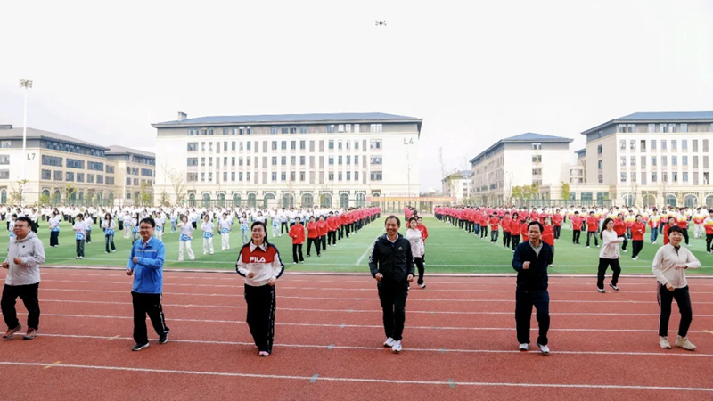 校领导为各二级学院送上了体育运动礼包,并为校学生运动队、心晴行动队、青衿合唱团等队伍授旗。旗帜挥舞,责任在肩,彰显了学校全员助力学生全面发展的坚定决心。该校党委书记刘红霞宣布活动正式启动,全体在场校领导共同推动启动拉杆,标志着“促进学生身心健康行动”全面拉开序幕。启动仪式后,一场全员健身操将气氛推向高潮。随着发令枪响,健康跑队伍矫健出发,学子们奔跑的身影,成为了“健康行动”最生动的注脚。