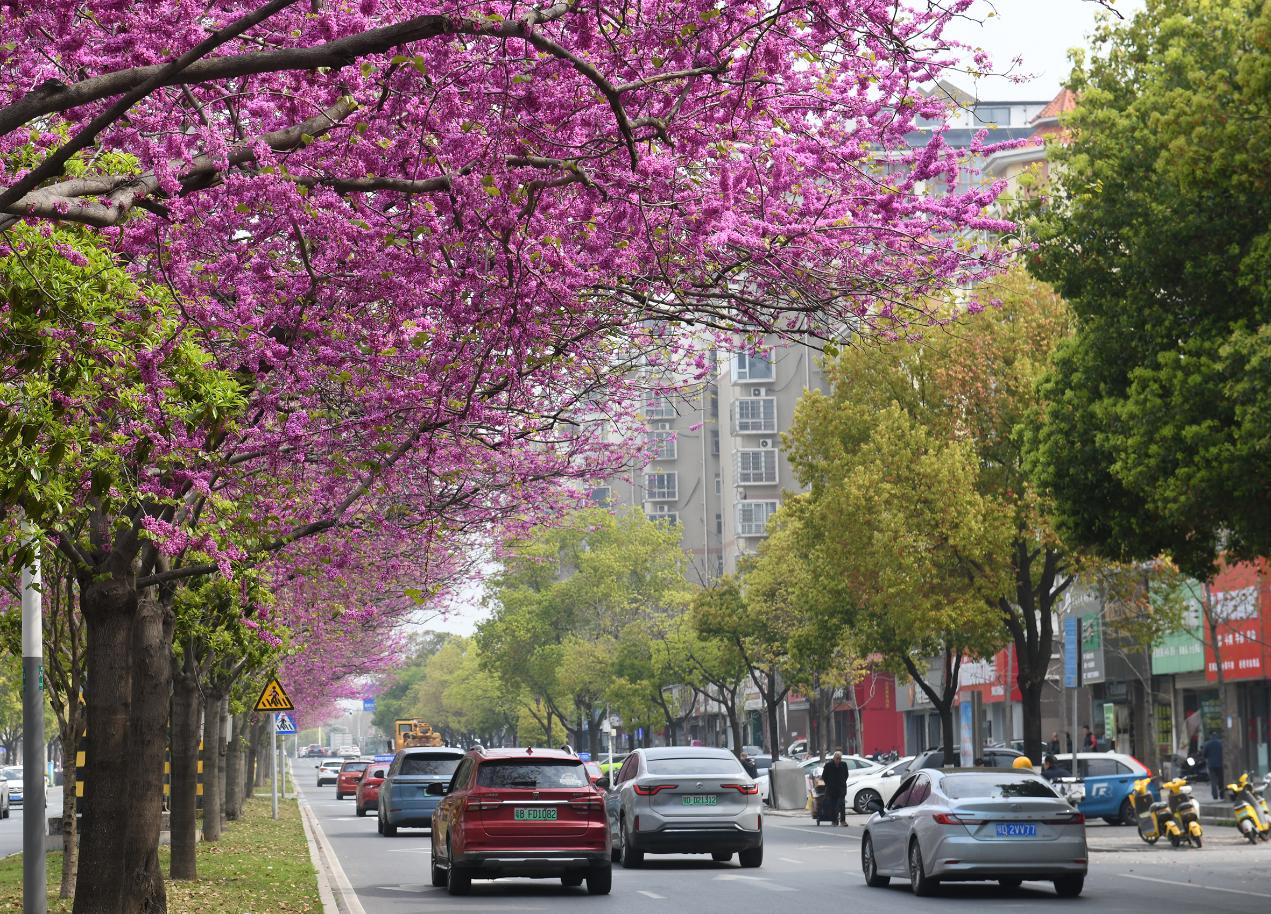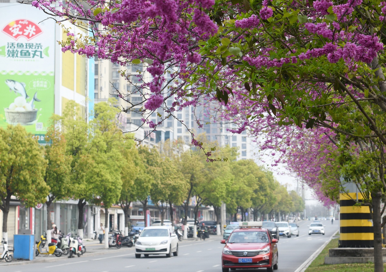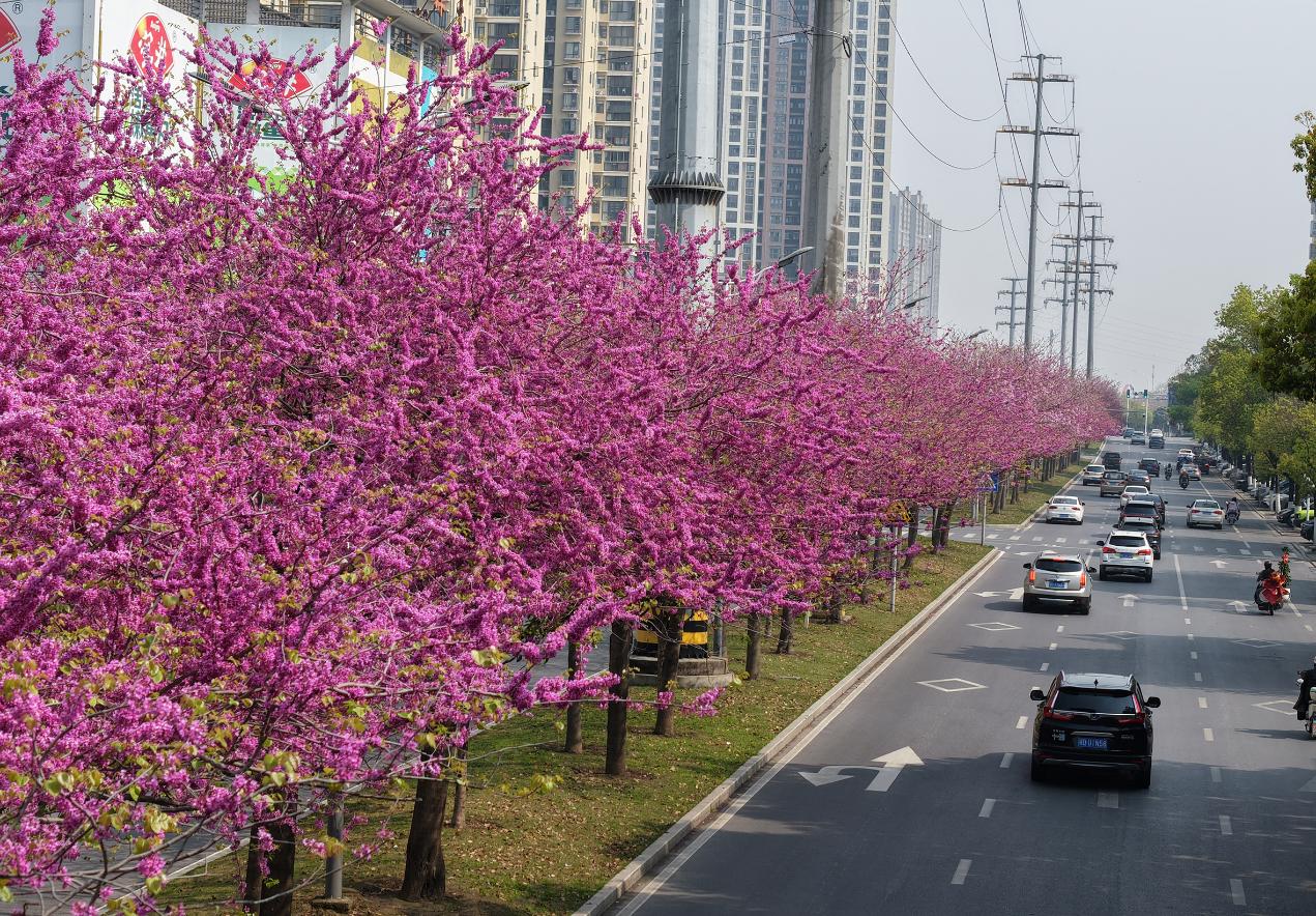 3月27日下午,湖北省荆州市武德路800多株紫荆花迎风盛放,一片春日胜景。