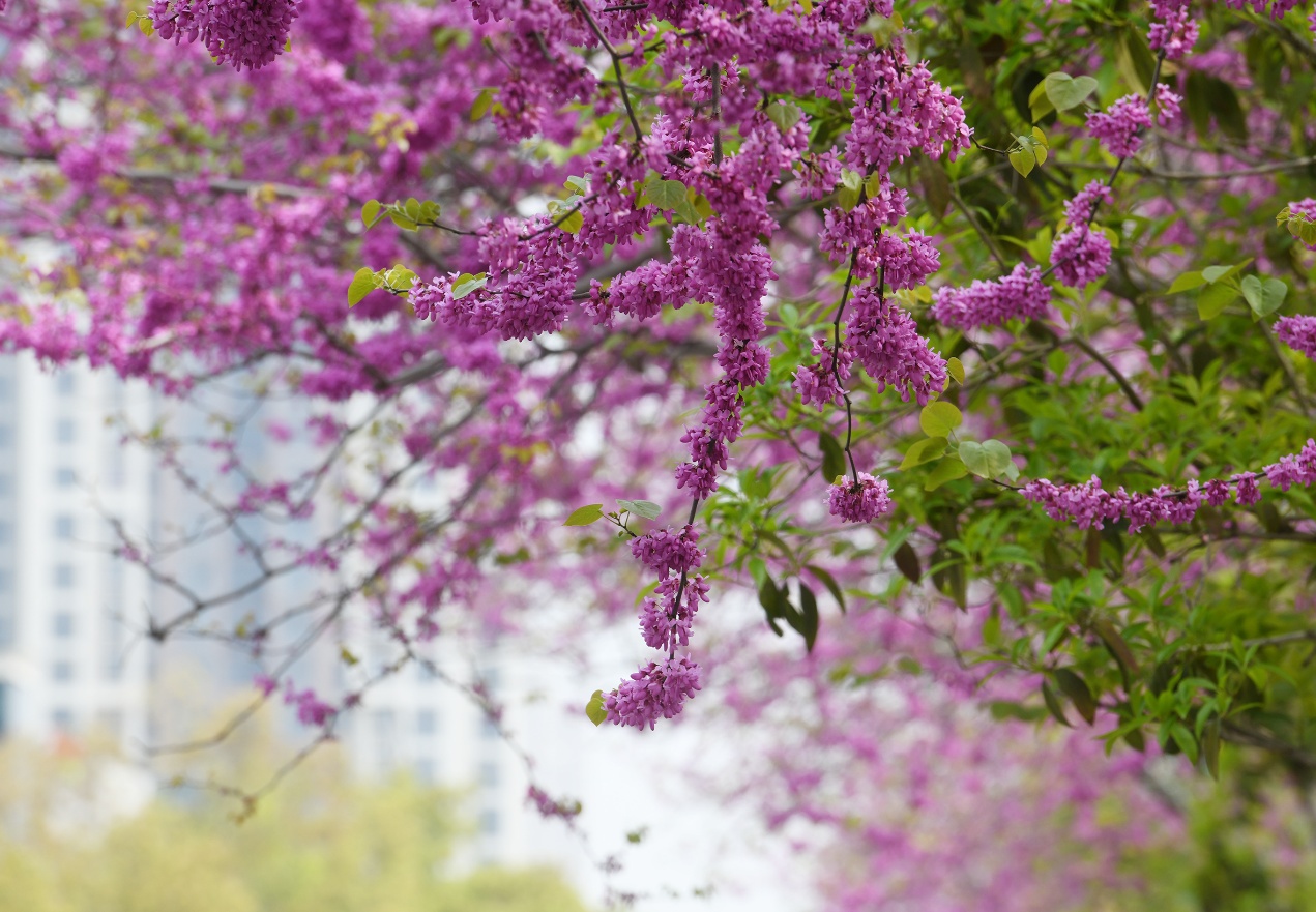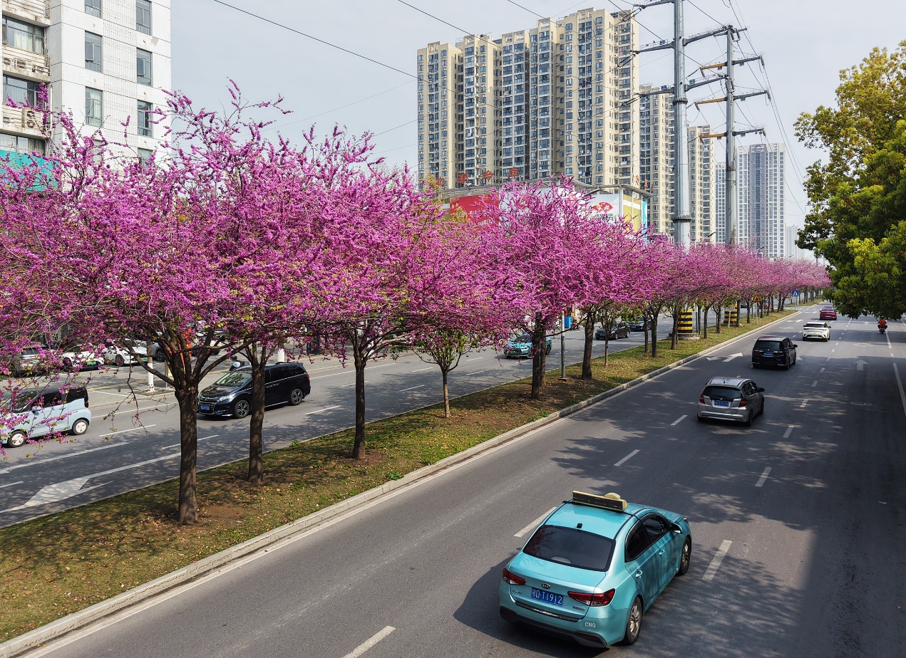 眼下,武德路沿线的2000米长道路花坛内,紫荆花正值盛花期,像石榴籽一般大小的花瓣缀满了枝头,一串串、一团团相拥相依,仿佛在诉说着春天的过往,在两侧绿色香樟与城市建筑的映衬下,尽显春日浪漫风姿。