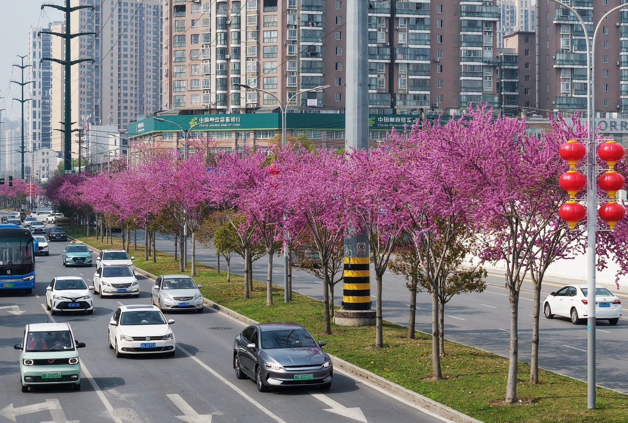 近年来,荆州市精心打造城市特色花景,在武德路、首辅路、景明观路等路段栽植上千株紫荆花。同时,在荆沙大道、江津路、复兴大道等主次干道,引种了几十种类型的景观花树。这些花树四季繁花次第开,绘就“四时皆景、月月有花”的城市画卷,为日新月异的荆州不断增添生态颜值与城市魅力。