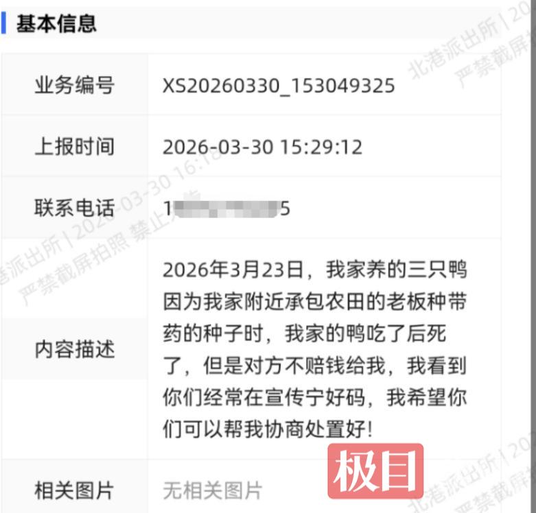 一筹莫展之际,黎女士想起了不久前通城县公安局北港派出所民辅警上门张贴“宁好码”时的叮嘱:“邻里有纠纷、遇困难,扫码反映或拨打民警电话都能求助。”抱着试试看的心态,3月30日下午,黎女士用手机微信扫描“宁好码”,将鸭子误食种子死亡的赔偿纠纷详细反馈给了派出所。