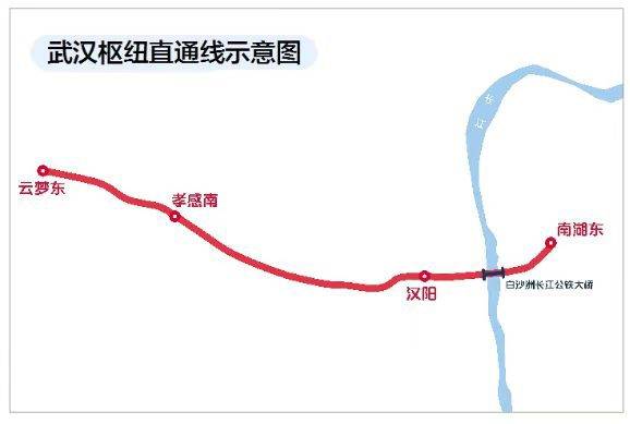 武汉枢纽直通线是为破解这一瓶颈而建。据了解,武汉枢纽直通线起自汉十高铁云梦东站,经新建孝感南站、汉阳站及白沙洲长江公铁大桥过江,至南湖附近接武黄城际,新建线路全长约80公里,项目计划建设工期5年,是国家高铁“八纵八横”沿江通道的重要组成部分。