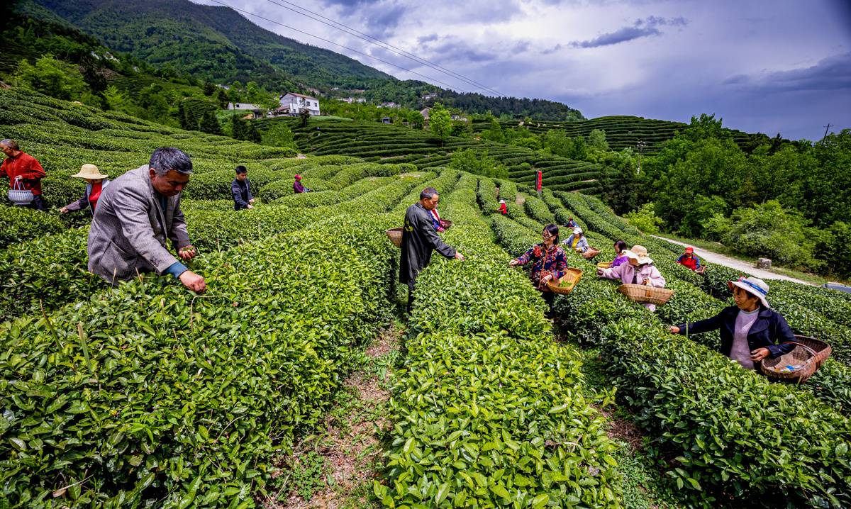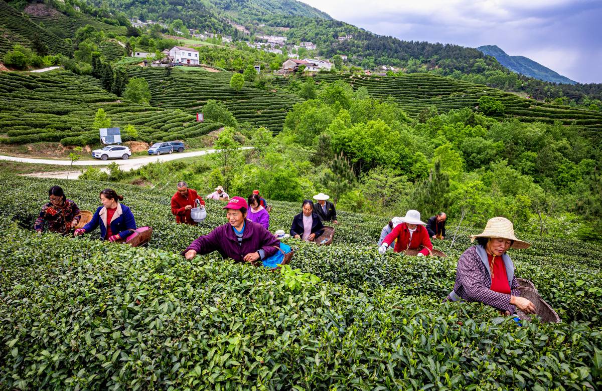 采茶工在保康县大树垭茶叶生态园内采摘春茶。(通讯员供图)