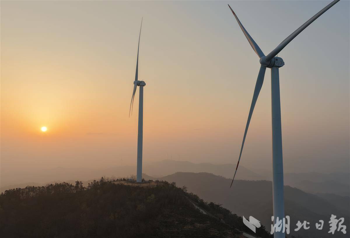 黎明破晓,晨曦为连绵的青山披上了一层暖金外衣。矗立在山巅的大风车,迎着清晨的山风旋转,将风能转化为清洁的电能。