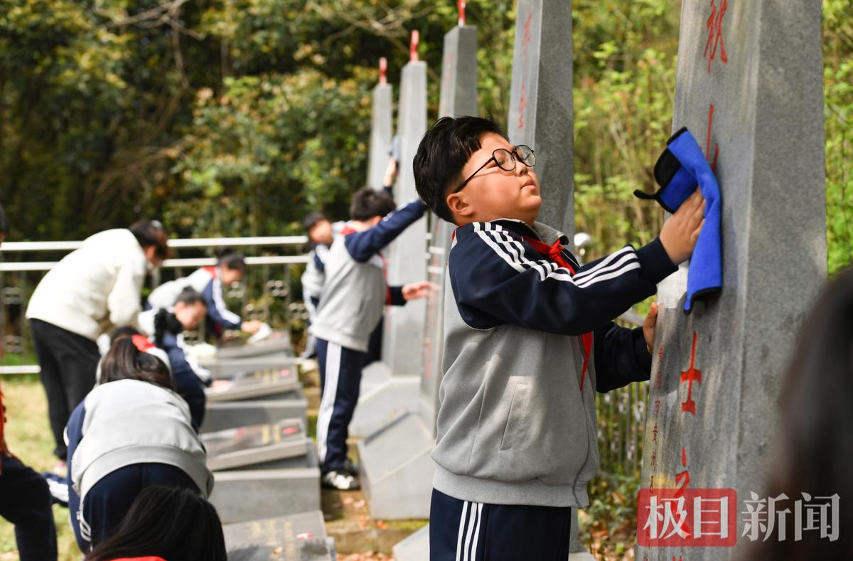 为烈士墓碑除尘。