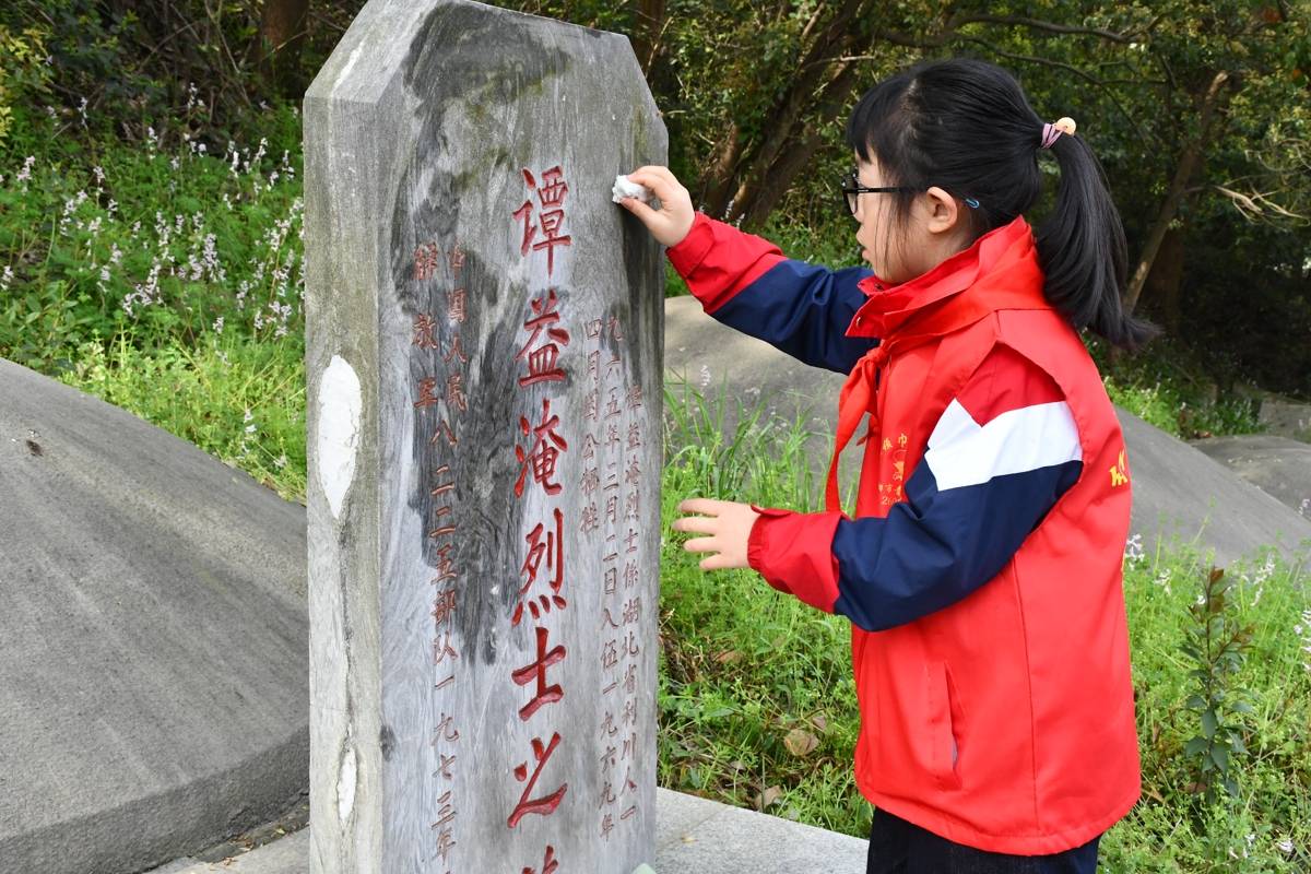 小小志愿者仔细擦拭墓碑。