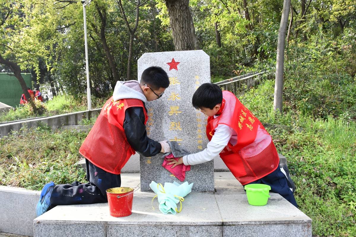 小小志愿者们怀着无比崇敬的心情,双膝跪地,用稚嫩的小手细细擦拭墓碑。一双双稚嫩的小手,与当年紧握钢枪保卫襄阳的大手,在此刻跨越时空,紧紧交握。