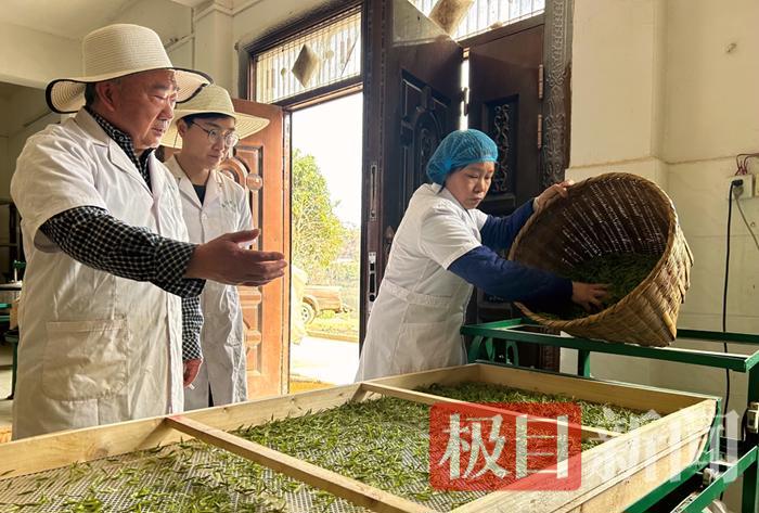 70多岁的陈玉海与茶叶相伴40年,是圈内公认的“茶专家”,也是合作社请来的技术指导,手把手教学茶叶制作技巧。“明前茶贵如金,每一步都靠经验手感,差一分火候就失一分风味。”说话间,他指导工人调试滚筒杀青机,确保温度达到300多度再进行炒制。师傅的“做茶先做人,手艺要精,良心要正”,成了陈铭坤的准则,他耗时3年吃透非遗炒制10道核心工序,成为年轻一辈的非遗传承人。