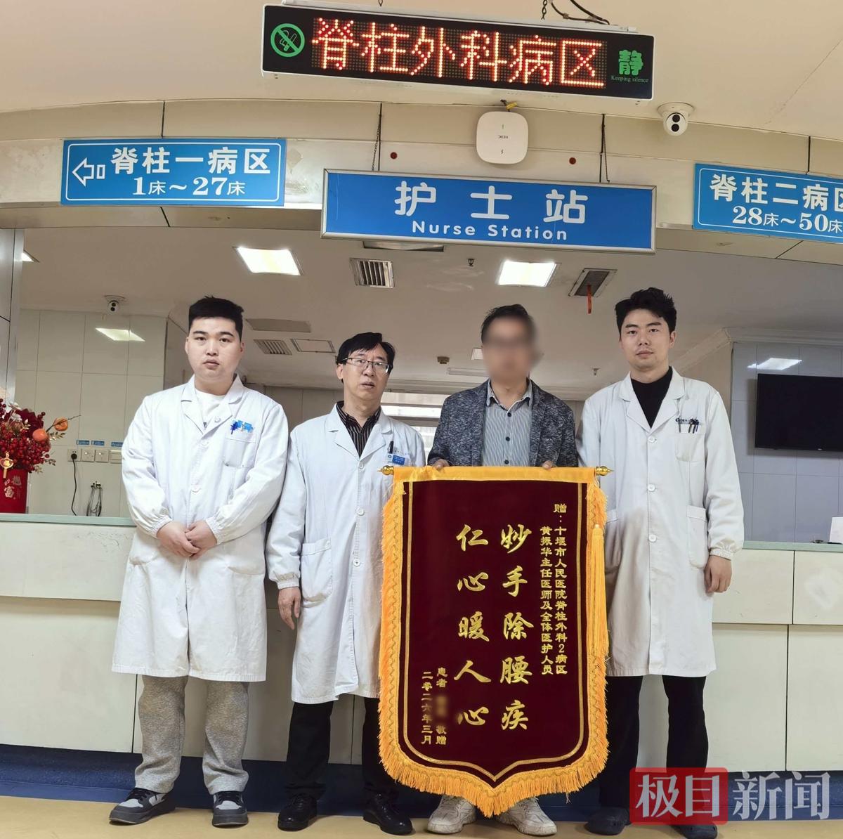 因腰椎间盘突出压迫神经,陈师傅多年来饱受下肢剧痛、麻木无力之苦,辗转多家医院保守治疗无效,一度连平卧都疼痛难忍,日常起居寸步难行。近日,他在十堰市人民医院脊柱外科二病区接受腰椎孔镜微创手术后,终于摆脱顽疾。康复出院时,陈师傅将一面锦旗,郑重送到黄振华主任、龚晓丽护士长手中,感谢医护团队用精湛的医术和贴心的护理让他摆脱疾病的困扰。