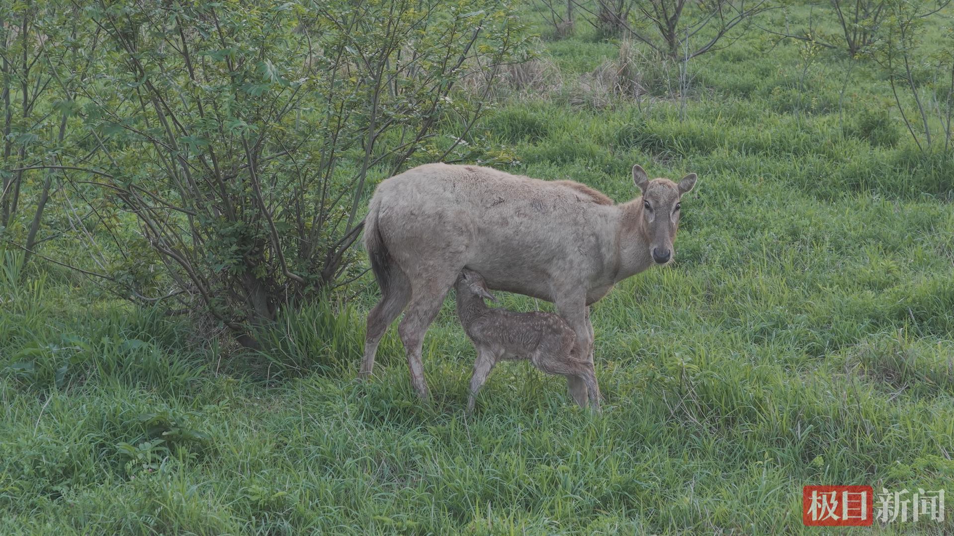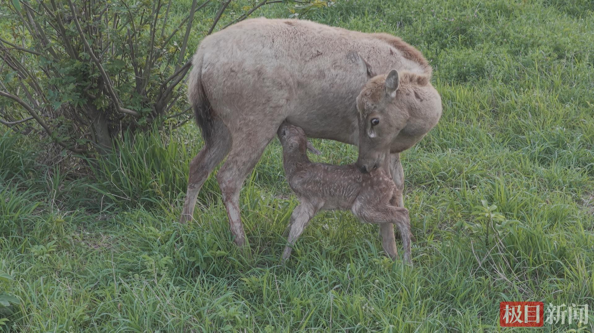 新闻记者通过一段现场拍摄的视频看到,在保护区的一处草场,一头母鹿正在给麋鹿幼崽哺乳,还时不时舔舐着幼崽的背部。