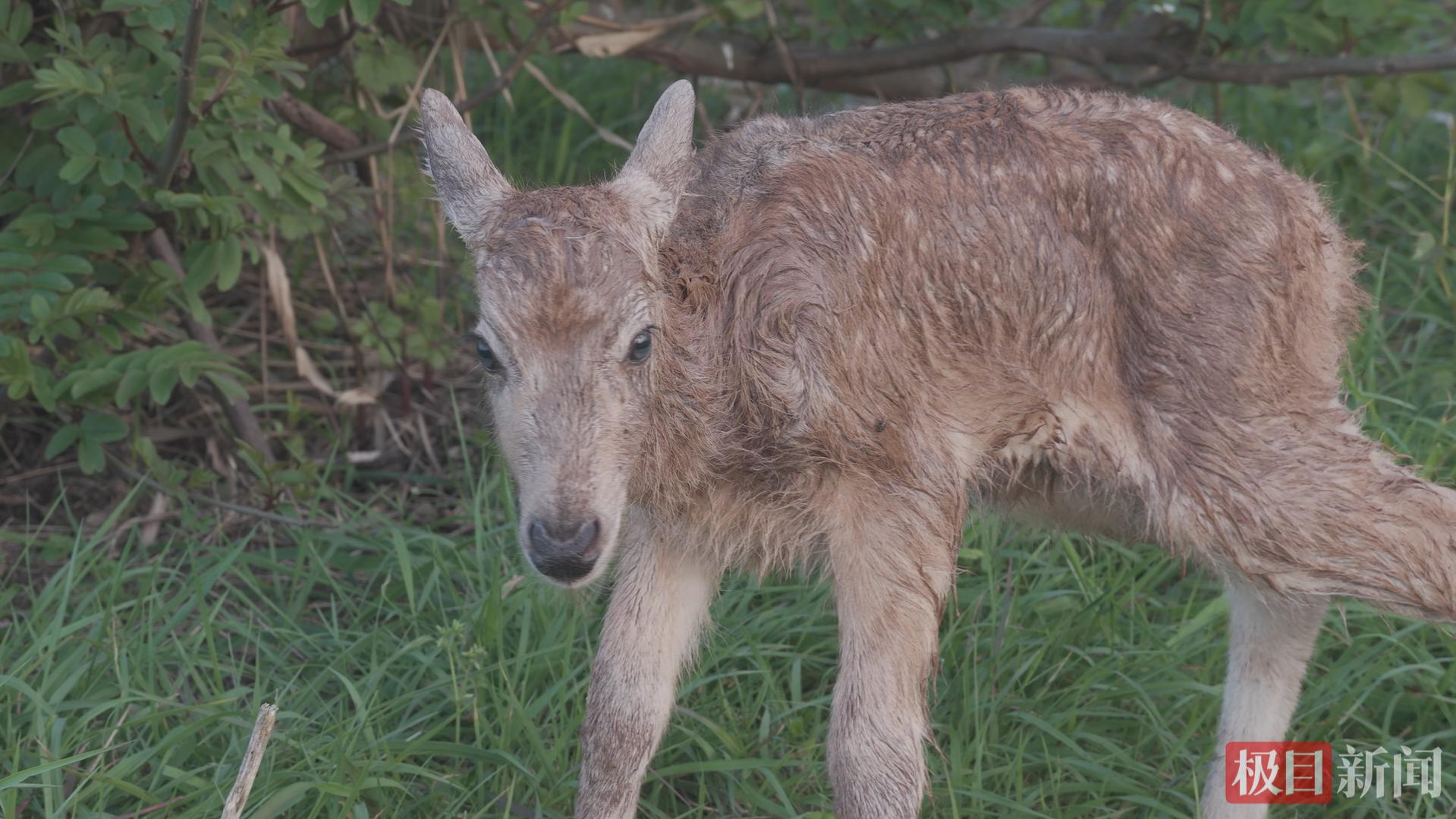 新闻记者通过另一段现场视频看到,出生不久的麋鹿幼崽的背部布满了梅花斑点,已经能站立行走,但左后腿并未完全伸直。视频画面显示,这头麋鹿幼崽还在悠闲地啃食青草。