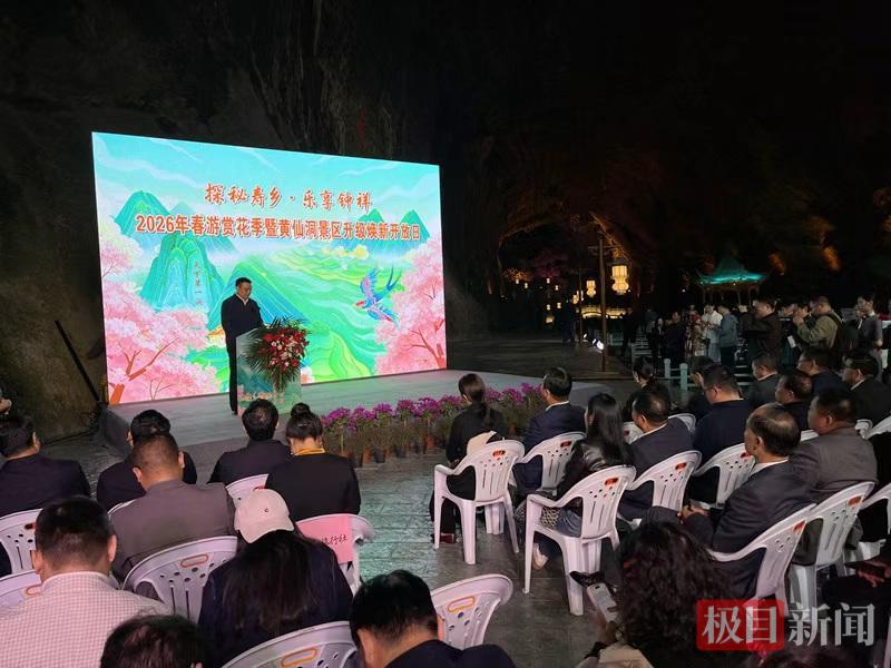 4月3日上午9点28分,在钟祥市黄仙洞景区洞口,“探秘寿乡·乐享钟祥”2026年春游赏花季推介暨黄仙洞景区升级焕新开放日活动在钟祥市客店镇盛大启幕,受邀企业家代表、旅行社代表、媒体记者及自媒体达人等200余人走进活动现场。