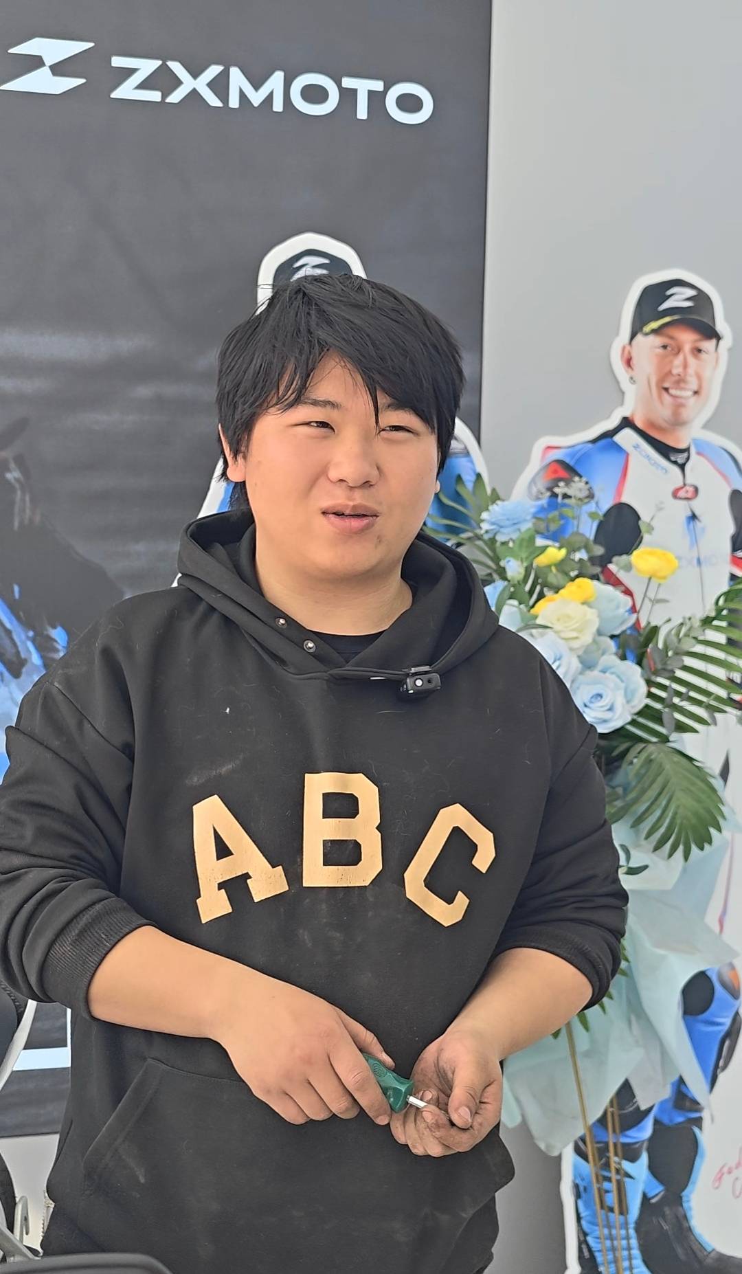 王嘉鑫目前是店里的一名学徒,对售前售后工作均有涉猎。他热爱摩托车,以张雪为榜样。提到张雪,他掏出手机,兴奋地向记者展示去年在年会上和张雪的合影。“他人非常和蔼可亲,一点架子都没有。”王嘉鑫说,“他还勉励我要好好努力。”