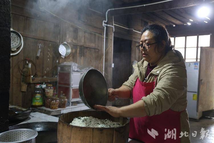 “我们这个水荞粑粑跟过年做的粑粑是一样的,打得越碎,它越糯,越好吃。”沈迎春的丈夫杨光强一边捶打石臼中的粑粑,一边解释道。
