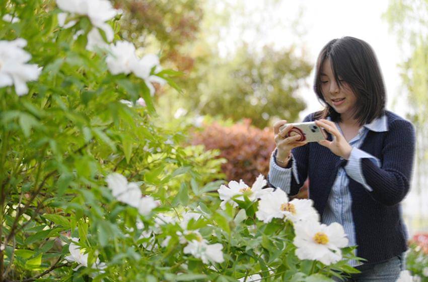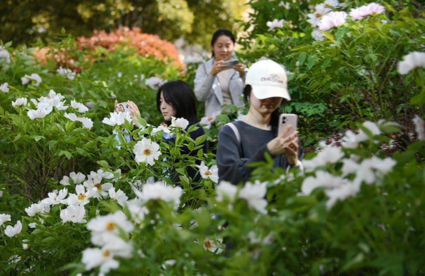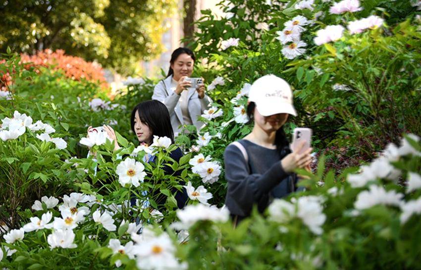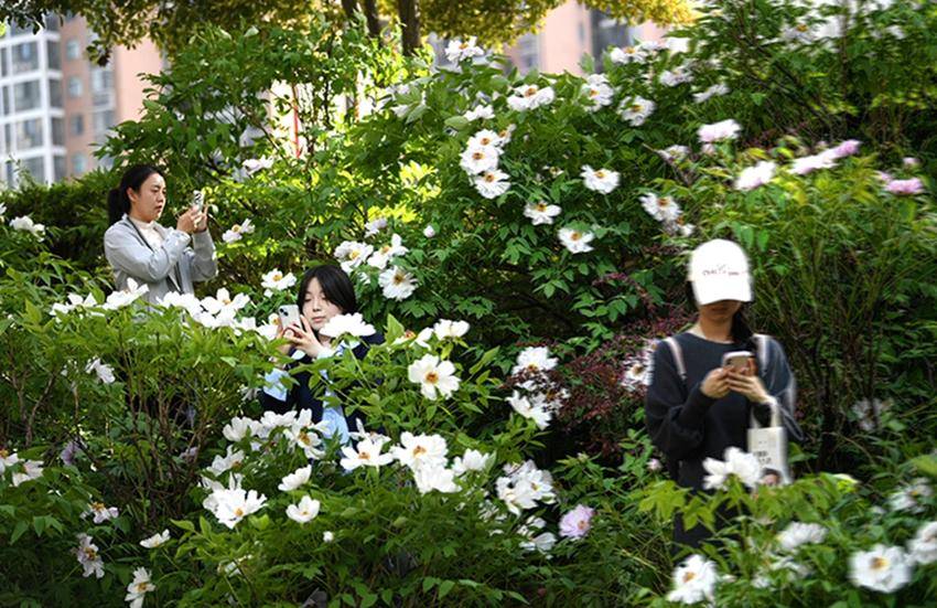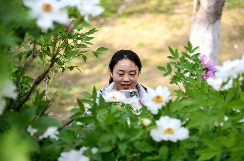 ▲▼游客在保康县清溪河景观公园观赏盛开的牡丹花。