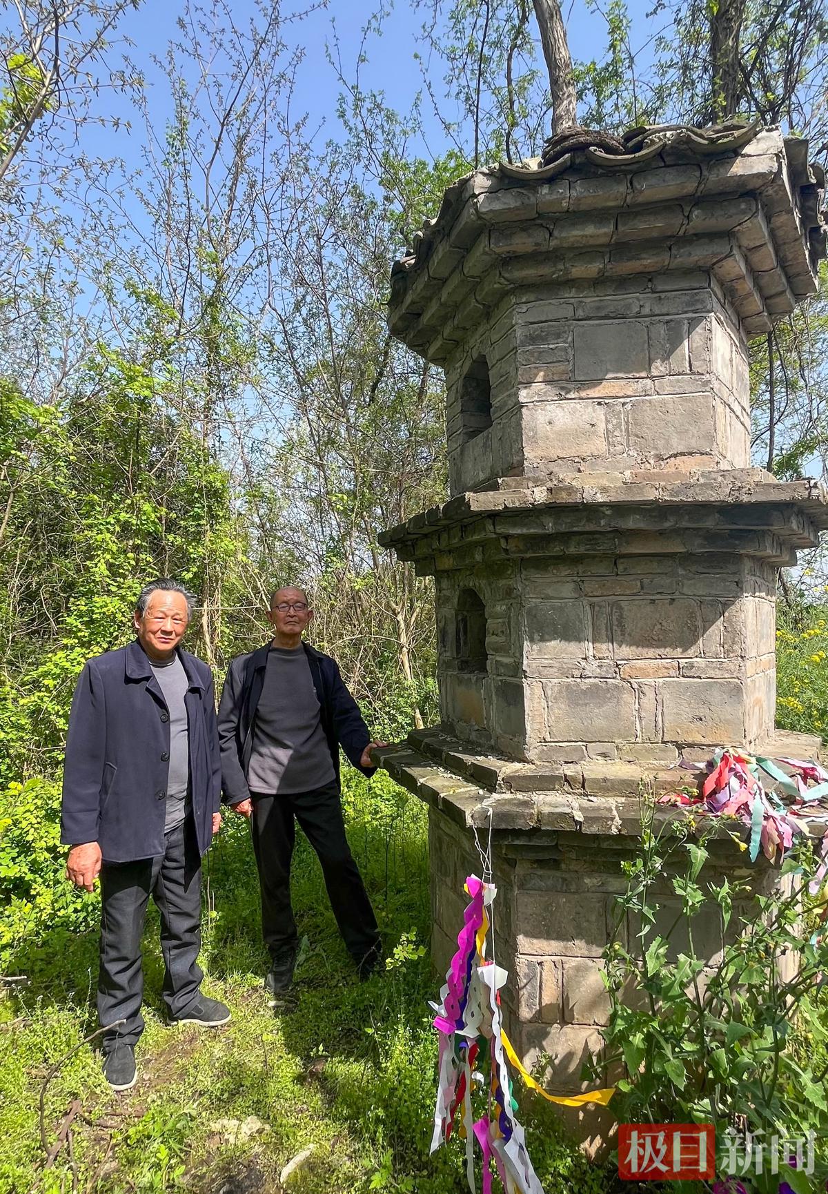 4月4日,湖北省监利市福田寺镇内荆河畔,复修后的“摆骨亭”旁,当地文史研究者杜好荣(左)和柳杨硕在祭奠英烈。(新闻记者 黄志刚 摄)