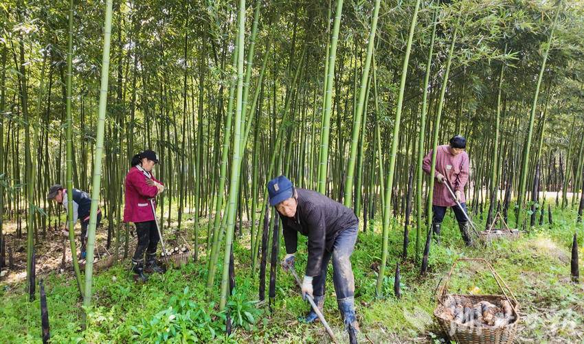 4月5日,走进长富雷竹专业合作社的种植基地,郁郁葱葱的雷竹林连绵成片,鲜嫩雷笋破土而出,林间地头处处是忙碌的身影。周边村民扛锄提筐,穿梭竹林间采挖、去壳、装筐,动作娴熟,脸上满是丰收的喜悦。
