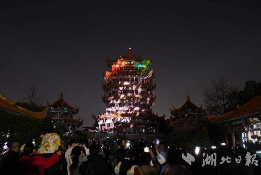 赏樱季期间,武汉黄鹤楼上新落樱光影秀。