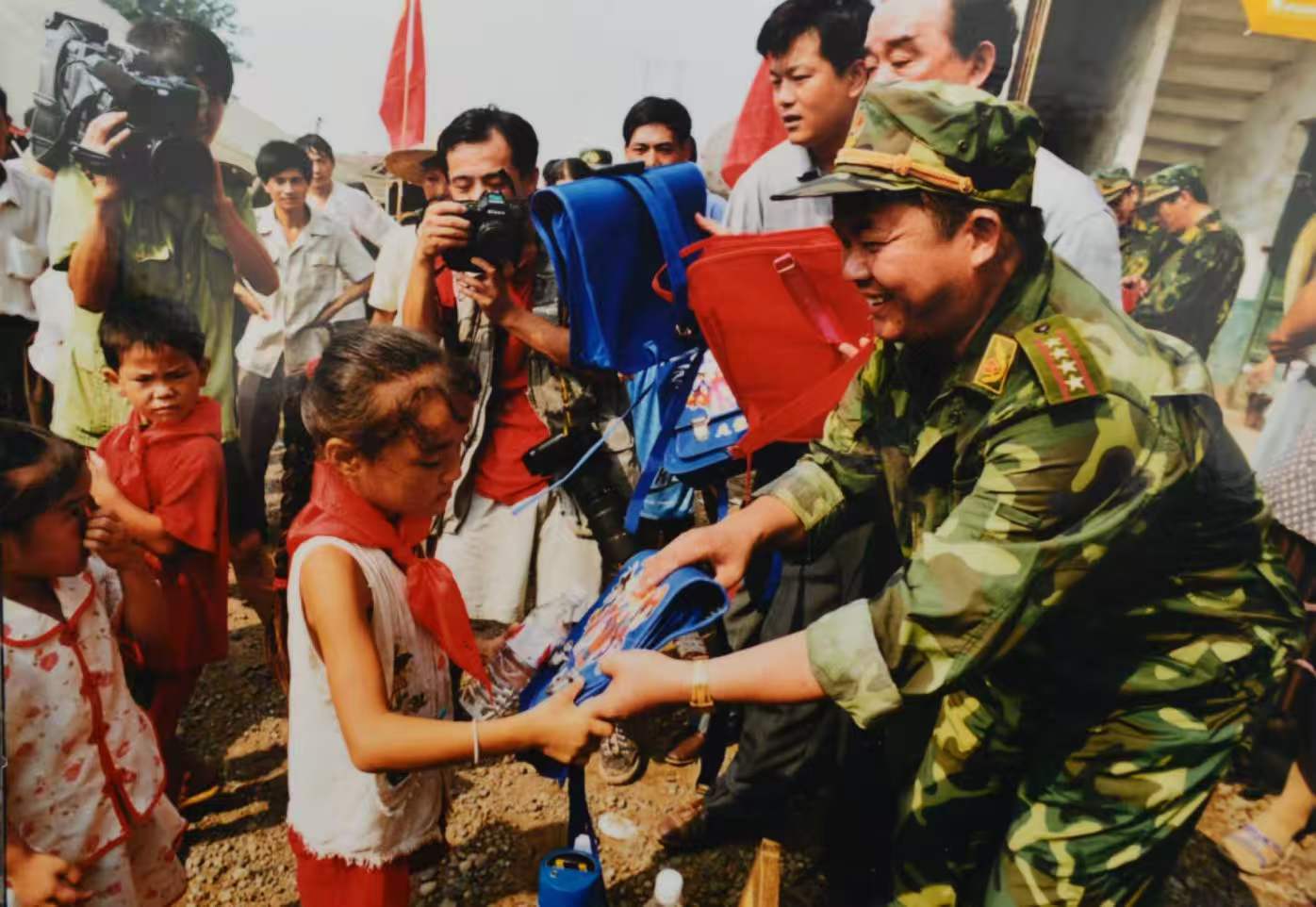 98年抗洪期间,胡建平(右)为公安县灾区儿童捐赠学习用品。