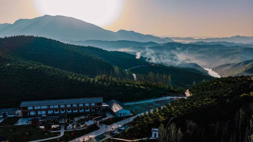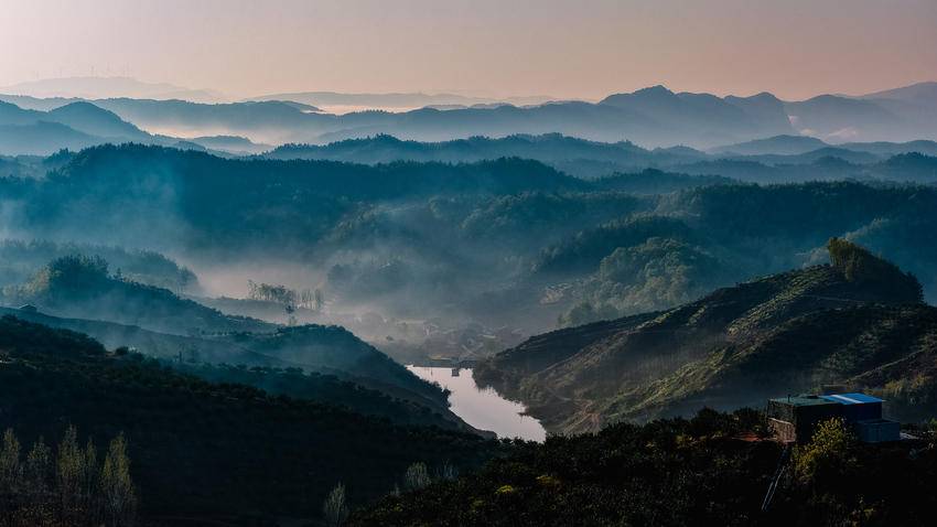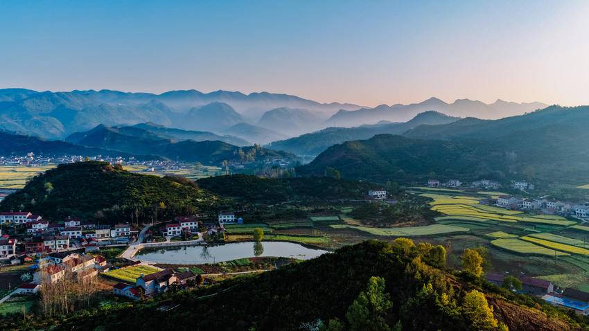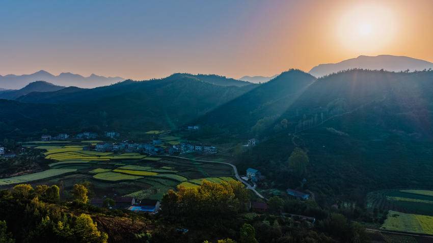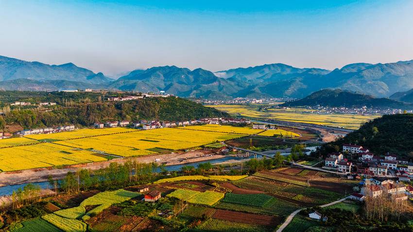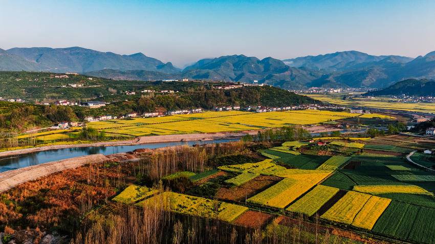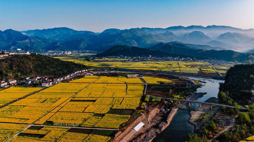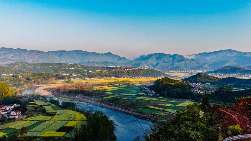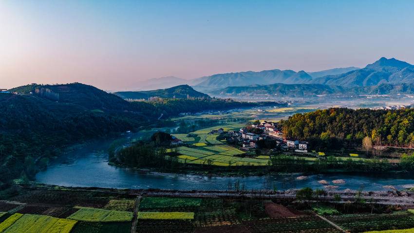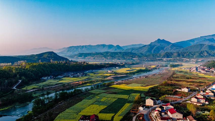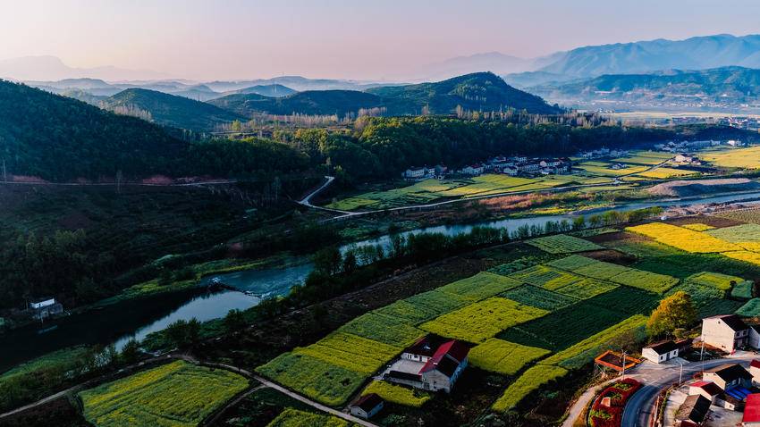 翠绿的树木,金黄的油菜,白墙黛瓦的民房,层峦叠嶂的山峰,潺潺流淌的河流,在晨雾中晕染成一幅鲜活的春日盛景图。