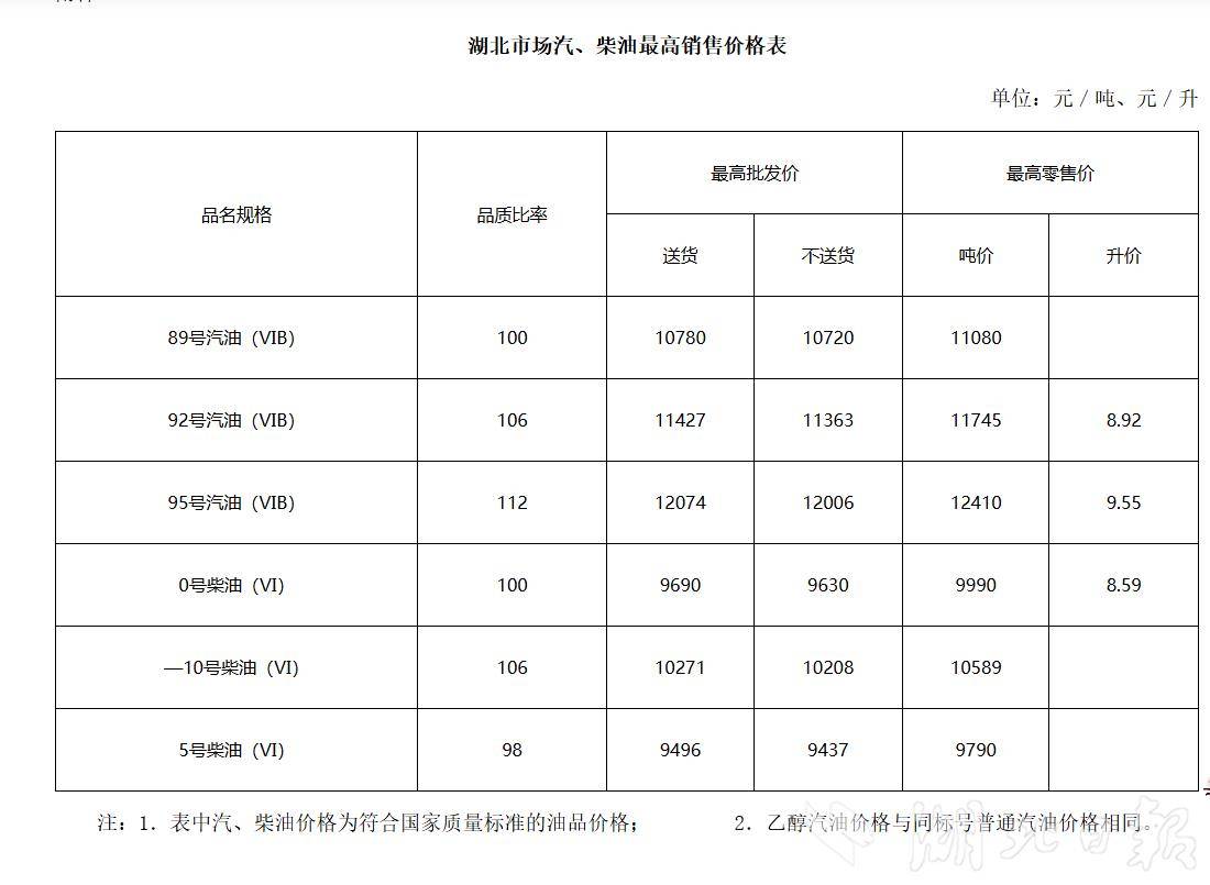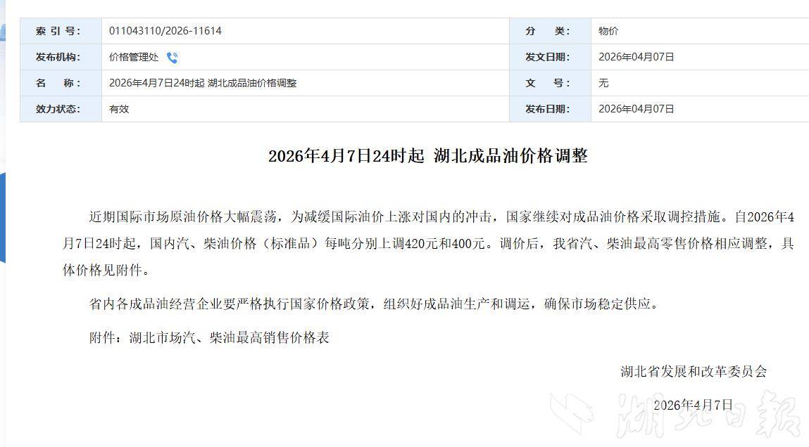 湖北日报讯(记者谢慧敏)我省新一轮油价调整正式确定。从省发改委价格管理处获悉,因近期国际市场原油价格大幅震荡,为减缓国际油价上涨对国内的冲击,国家继续对成品油价格采取调控措施,我省汽、柴油最高零售价格相应调整。自4月7日24时起省内92号汽油、95号汽油、0号柴油每升分别上调0.34元、0.37元、0.34元。调控后,每升分别涨至8.92元、9.55元、8.59元。比按照成品油价格机制计算,折合92号汽油每升少涨0.30元、95号汽油每升少涨0.32元、0号柴油每升少涨0.32元。