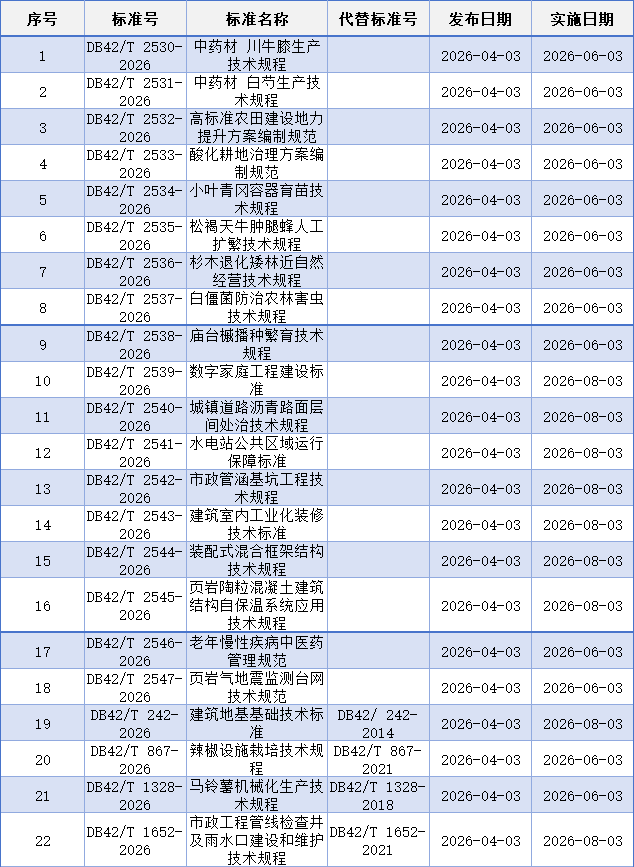 湖北日报讯(记者汪子轶、通讯员郭姗姗)4月3日,省市场监管局批准发布《中药材 川牛膝生产技术规程》《马铃薯机械化生产技术规程》《老年慢性疾病中医药管理规范》《建筑室内工业化装修技术标准》等22项地方标准。