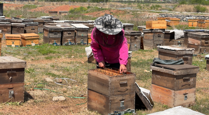 “现在有200箱,打算半月内分到400箱,然后到陕西赶个槐花,再到新疆赶授粉,一箱授粉费400元,总收入大约30万元。”蜂农蔡先英说。