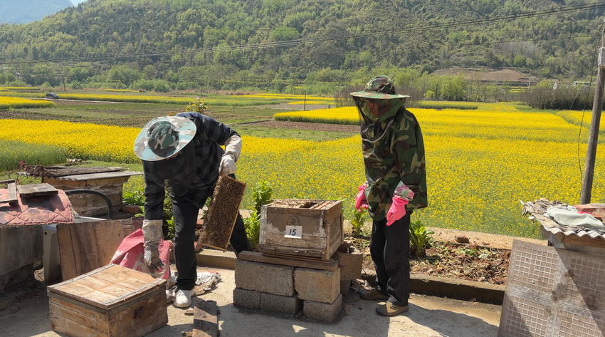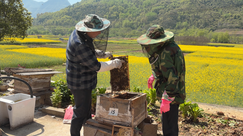 “我开始养蜂子没得技术,养一养就死了。后来,技术员给我们指导,越养越顺。我去年养了40笼,今年大概有60笼,估计能达到2万块钱。”秦明朗说。