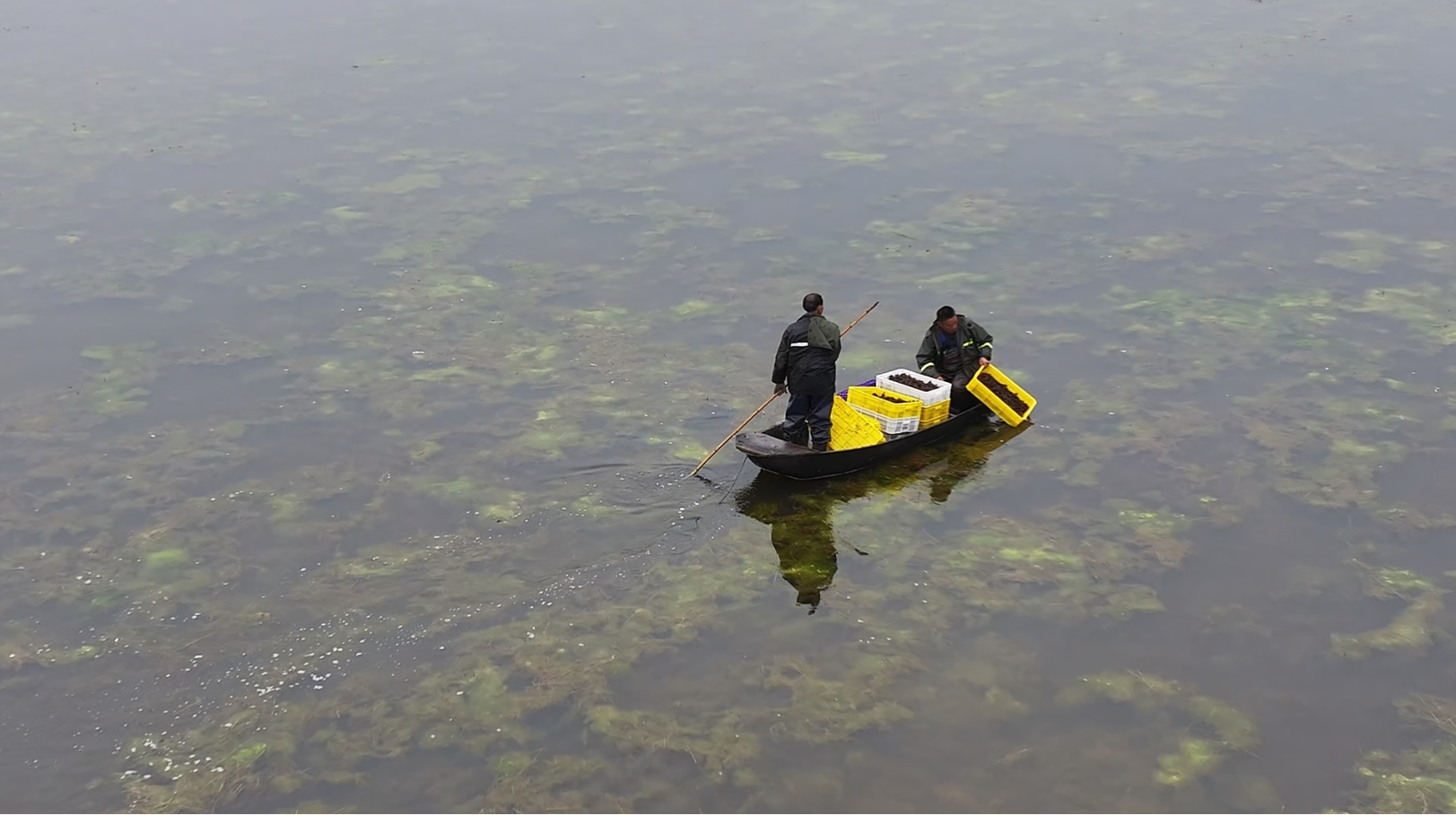 “放虾苗要选好天气,温差不能大,苗子必须优质、有活力!”郑培昌从船舱里抬出一筐活蹦乱跳的虾苗,均匀撒入塘中。