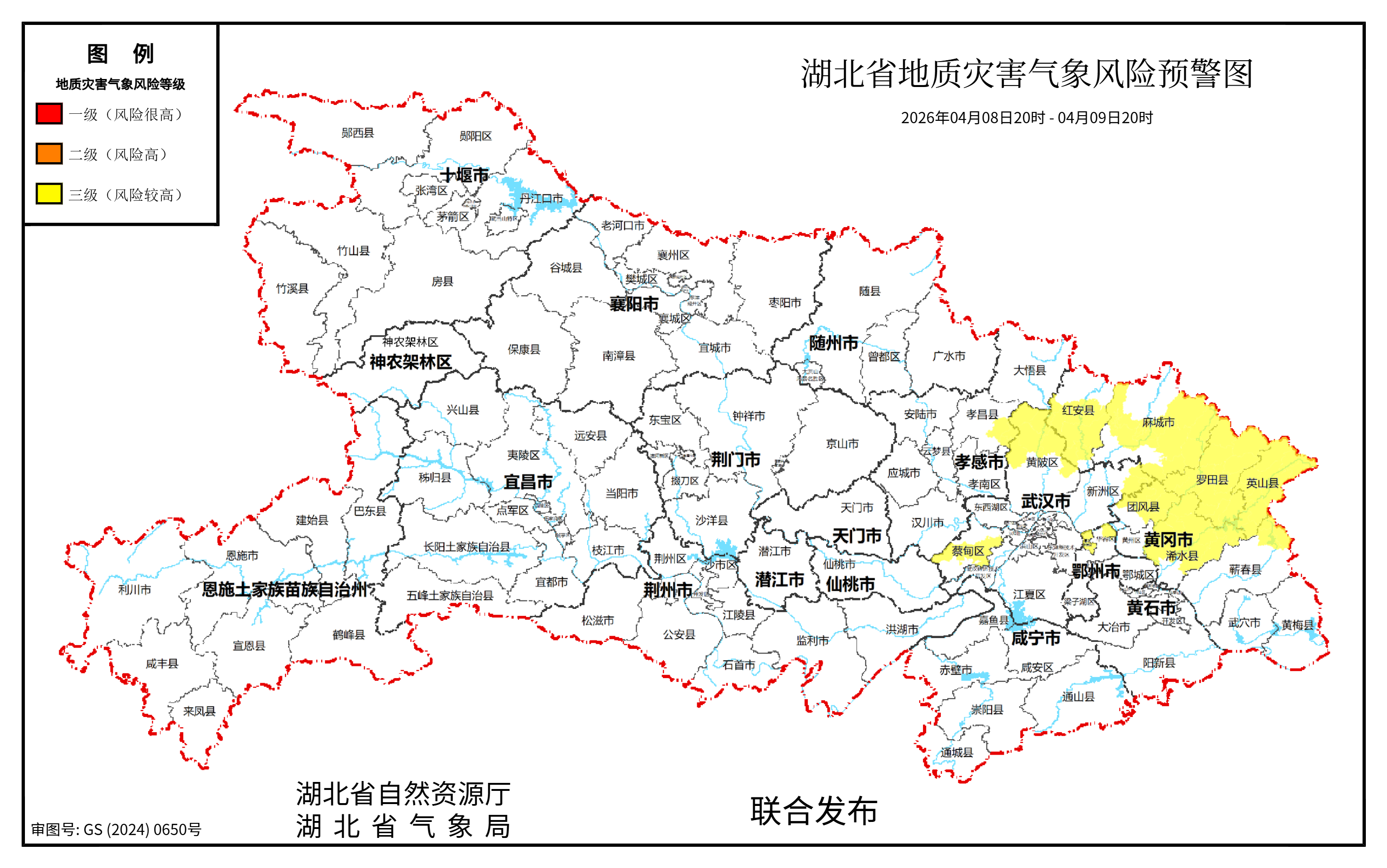 湖北日报讯(记者刘胜)4月8日晚,湖北省自然资源厅和湖北省气象局联合发布《地质灾害气象风险预警》。2026年04月08日20时-2026年04月09日20时,预计武汉(黄陂区北部和中部、新洲区东北部、蔡甸区中东部和西部)、孝感(孝昌县东部)、鄂州(华容区东北部、葛店开发区)、黄冈(红安县中部和南部、麻城市大部、罗田县、英山县、团风县北部和中部、浠水县大部、蕲春县东北部)以及其他强降水区域发生崩塌、滑坡、泥石流的风险较高。请注意防范。