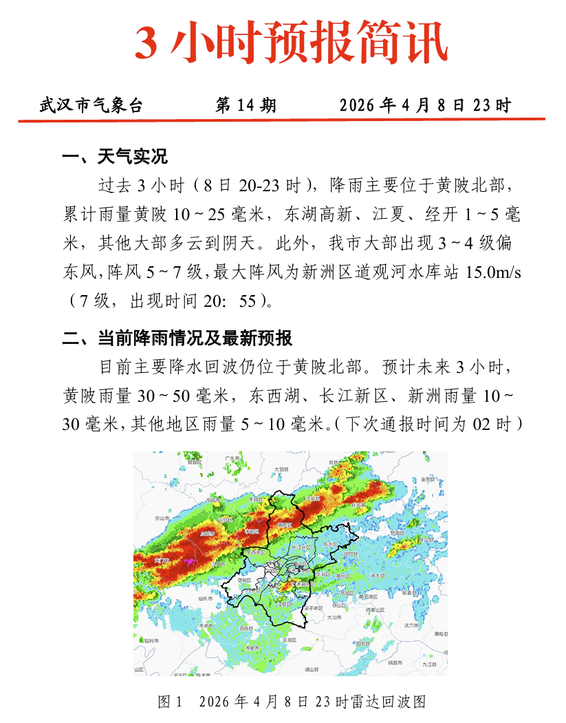 目前主要降水回波位于黄陂北部预计未来3小时黄陂雨量30~50毫米东西湖、长江新区、新洲雨量10~30毫米其他地区雨量5~10毫米