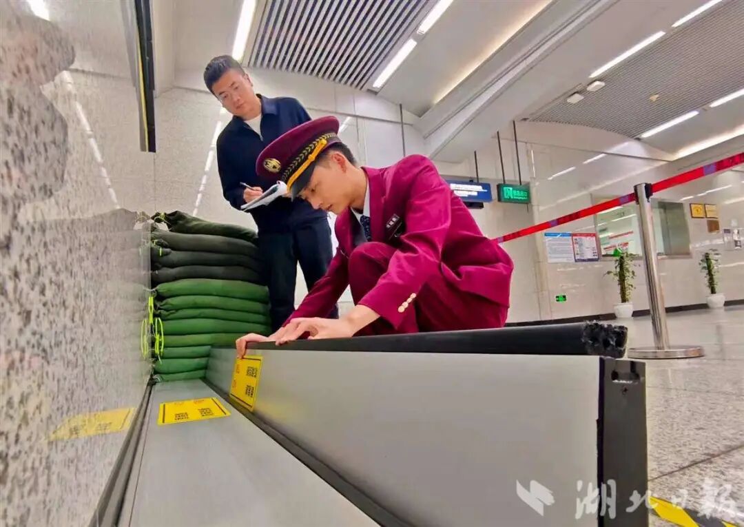 香港路站值班站长郑泽钰检查出入口防淹挡板(湖北日报通讯员杨浩摄)