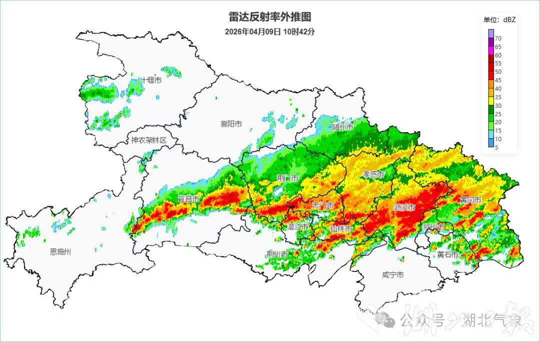 根据最新气象资料分析,截至4月9日上午,湖北省中东部地区上空仍覆盖着大面积的较强雷达回波,意味着降雨和对流天气仍在活跃。9日白天,江汉平原及鄂东地区还会有中到大雨,其中天门、仙桃、孝感南部、武汉南部、鄂州、黄冈南部等局地仍有暴雨,并伴有短时强降水、雷暴大风等强对流天气。省内其他地区则以小到中雨为主。
