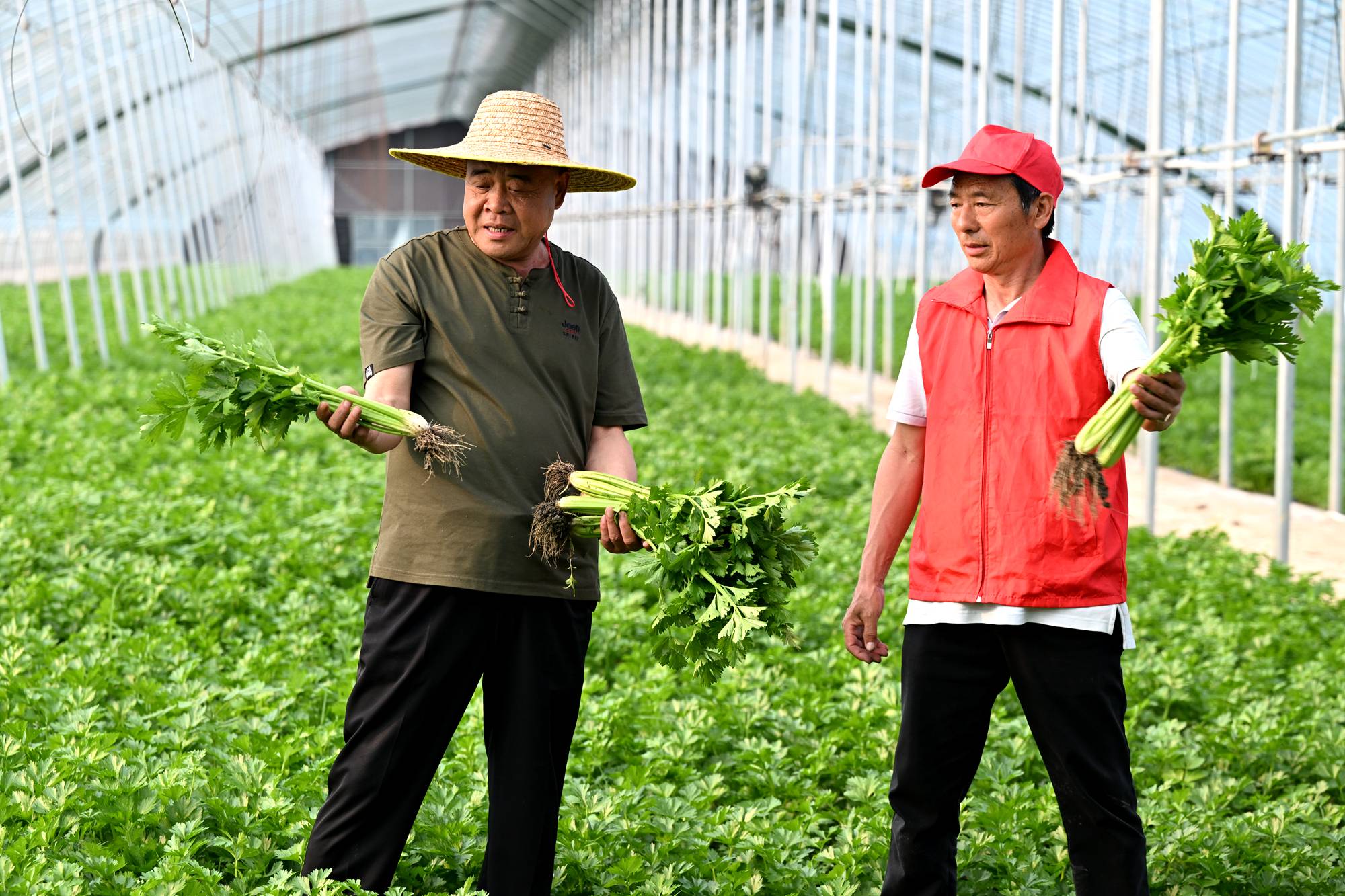 湖北寿福农业科技有限公司基地负责人王寿福(左)在收获水果芹菜。