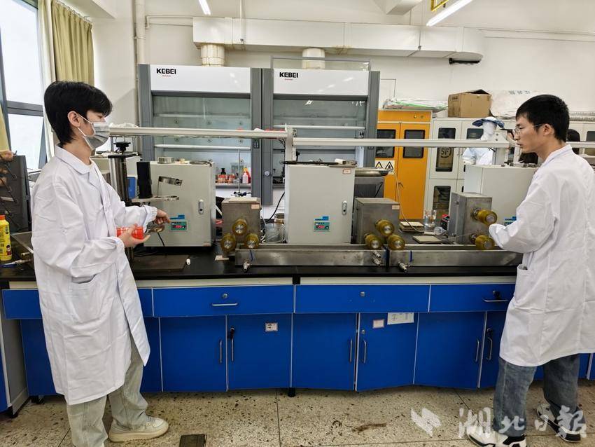 4月9日,全球首件循环再生新衣亮相武汉纺织大学,科研团队在演示纺丝成型工艺。(湖北日报全媒记者包东喜摄)