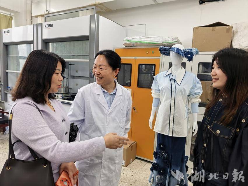 4月9日,全球首件循环再生新衣亮相武汉纺织大学,王金凤教授与团队成员杨晨向校内老师介绍新衣研制过程。(湖北日报全媒记者包东喜摄)