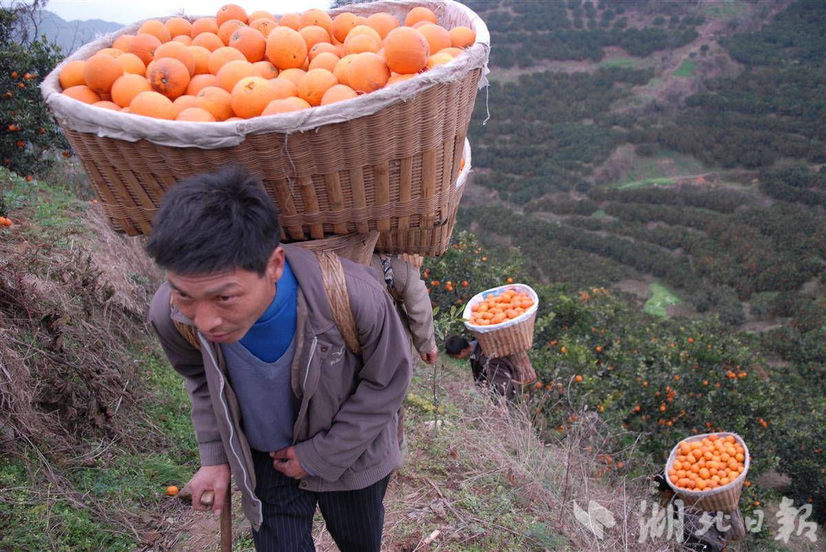 2007年12月,橘农们背着沉甸甸的脐橙,沿着陡峭山路艰难跋涉,用背篓一筐筐将丰收果实背出大山。