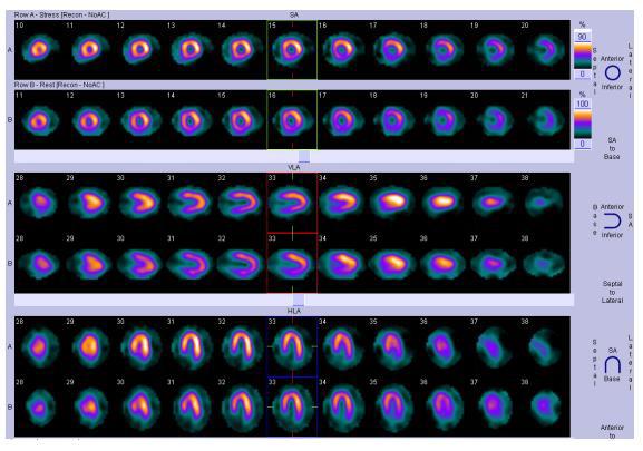 心肌灌注显像检查显示,李先生静息状态下左室各壁显像剂分布正常,但负荷状态下左室下壁显像剂轻度减低。“这提示左室下壁存在可逆性心肌缺血。”王玲医生解释,“同时门控数据提示,心脏收缩及舒张功能、室壁运动情况基本正常。”也就是说,李先生虽然没有明显血管狭窄,但部分心肌已经出现供血不足,只是心脏代偿能力较强,只有在负荷状态下,心肌才会出现缺血表现。及时的心肌灌注显像检查可以帮助医生及时调整用药方案,有效避免病情发展为心肌梗死。