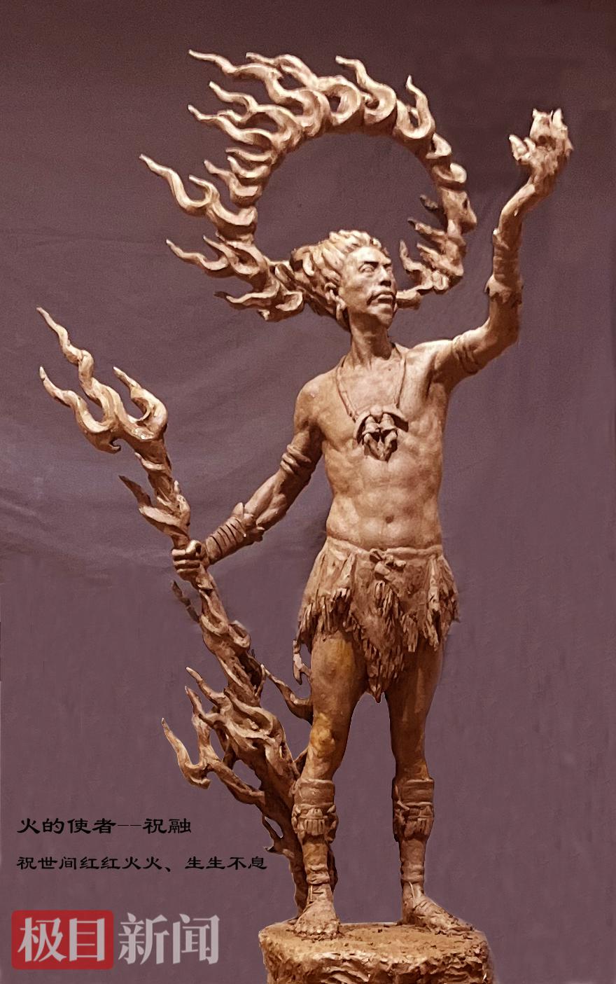 神祇类核心作品《祝融》同样亮眼,金主色调尽显火神威严,身躯挺拔、衣纹舒展,周身仿佛萦绕火焰气场,面部庄重肃穆,跳出楚文化单一视角,凸显华夏共祀火神的大气形象,让人能与上古火神隔空对话。