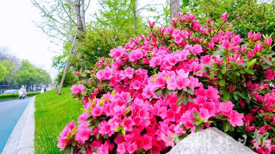 在临江大道万达游园,连片的角堇经雨水浸润,花色愈发浓艳,如粉紫色绒毯铺展在绿地之上,搭配造型灌木与艺术雕塑,让临江步道变身诗意花园;天鹅路沿线,红、粉、紫交织的超级凤仙花带沿道路延伸,杜鹃、喷雪花等花卉在雨后吐露芬芳,骑行市民穿梭其间,通勤之路变身赏景之旅。