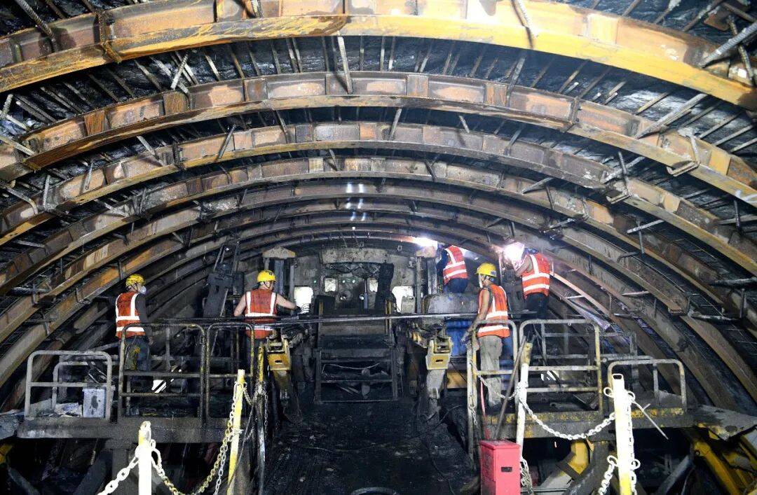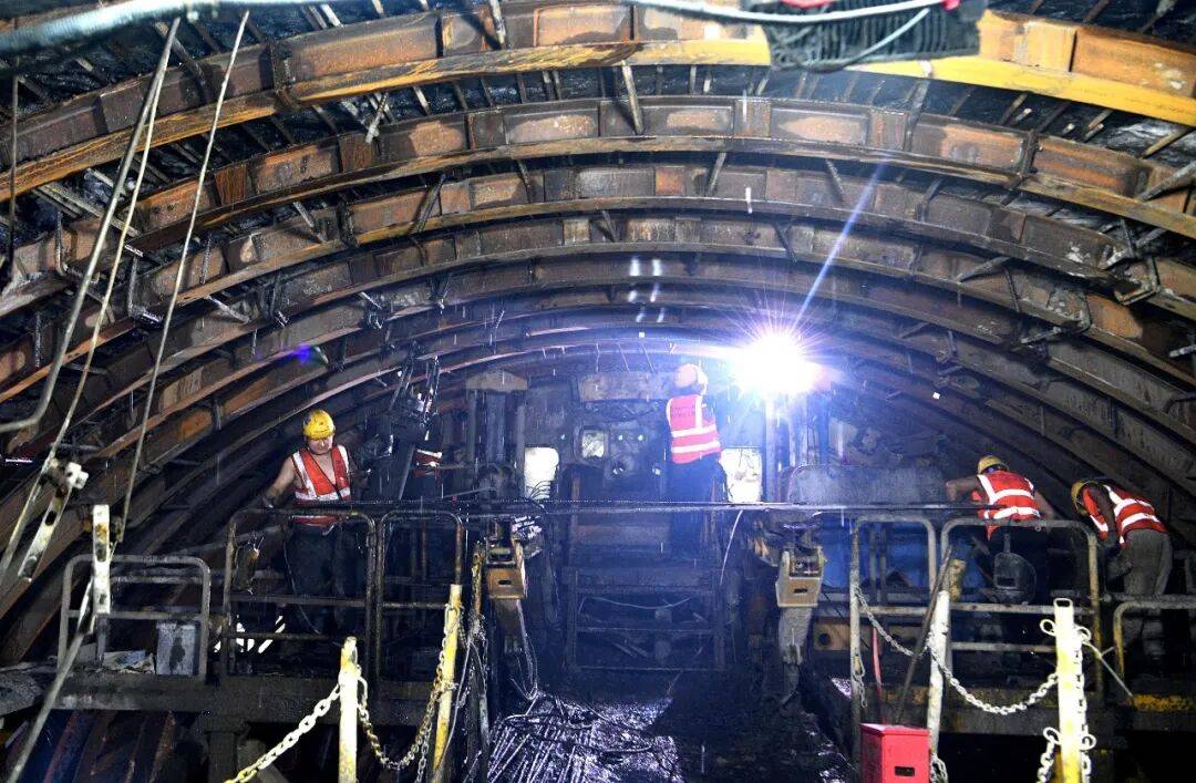 在地下300多米的建设现场,巨大的TBM机头后方,工人们正紧张有序开展钢拱架支护作业,对刚刚掘进完成的洞身围岩进行加固。
